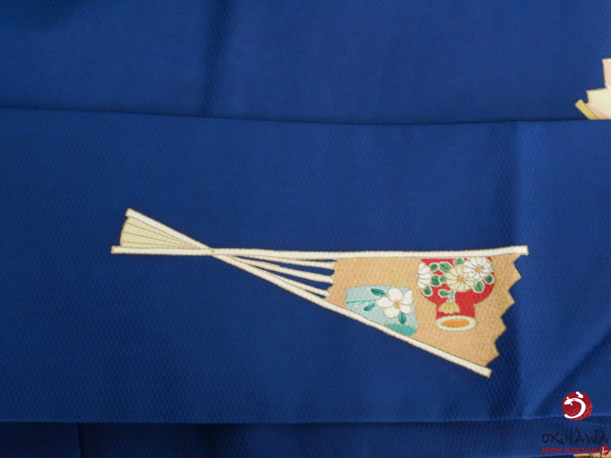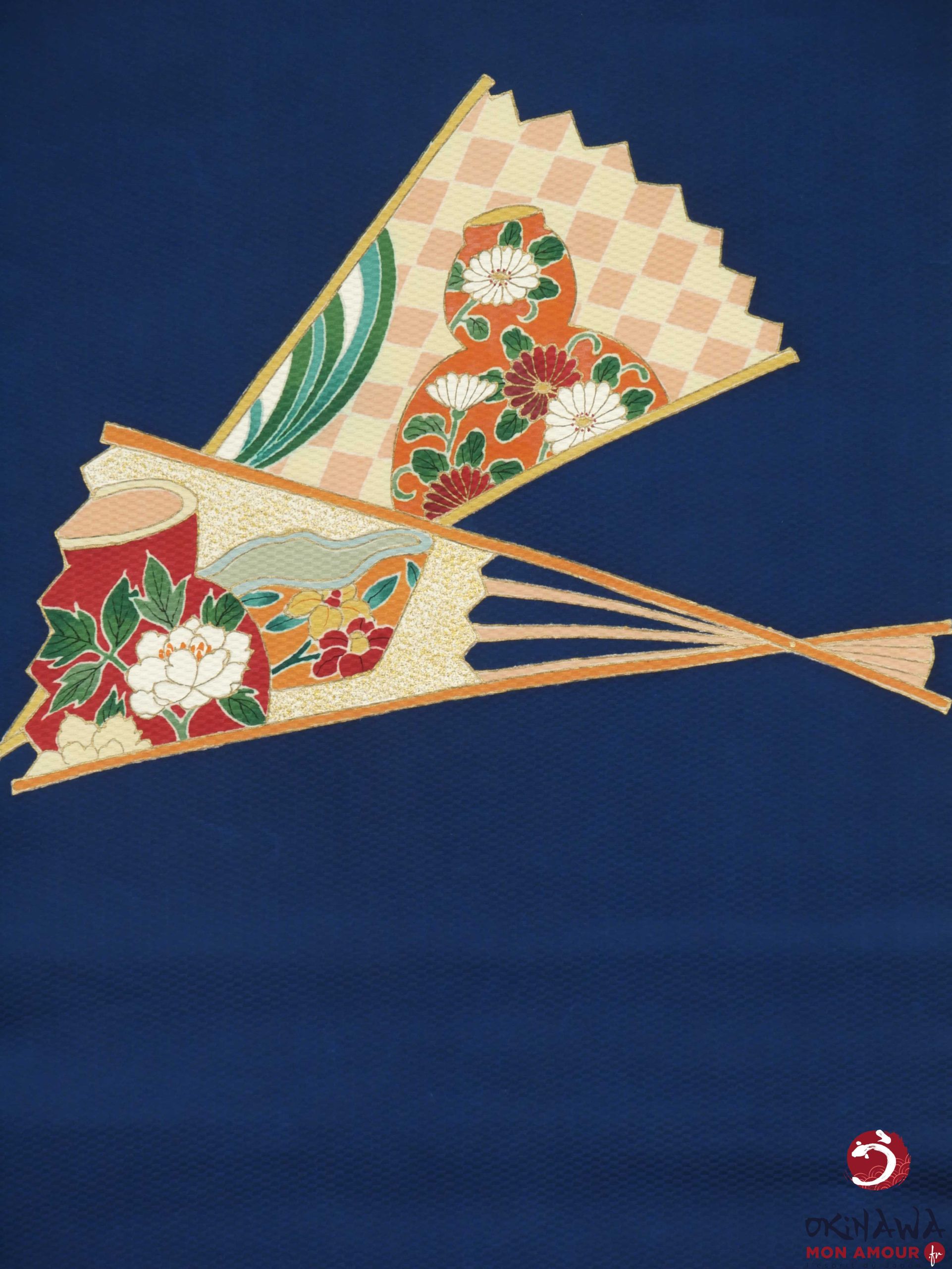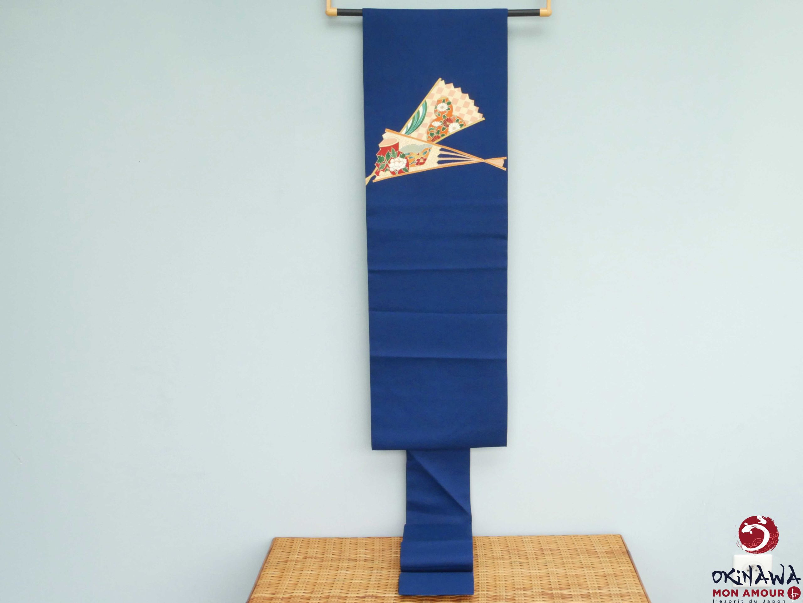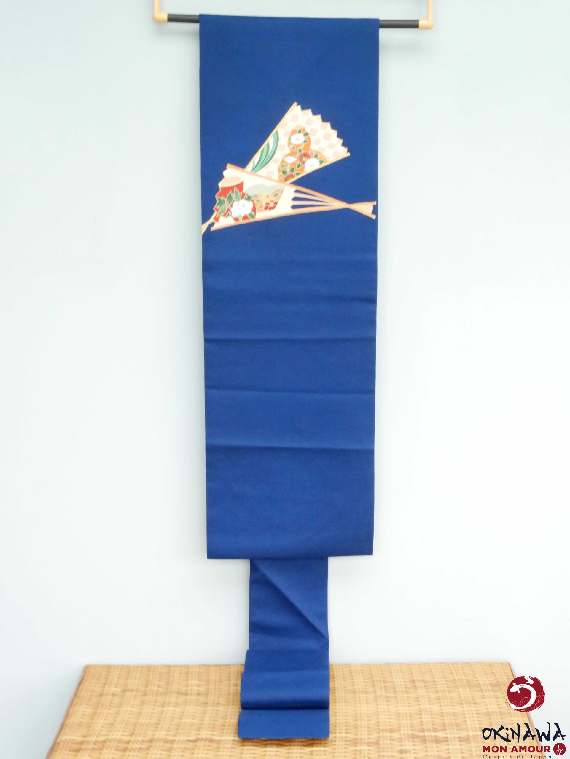 Ceinture de kimono en soie, de type nagoya obi, couleur bleue, légèrement texturée, avec des éventails colorés.