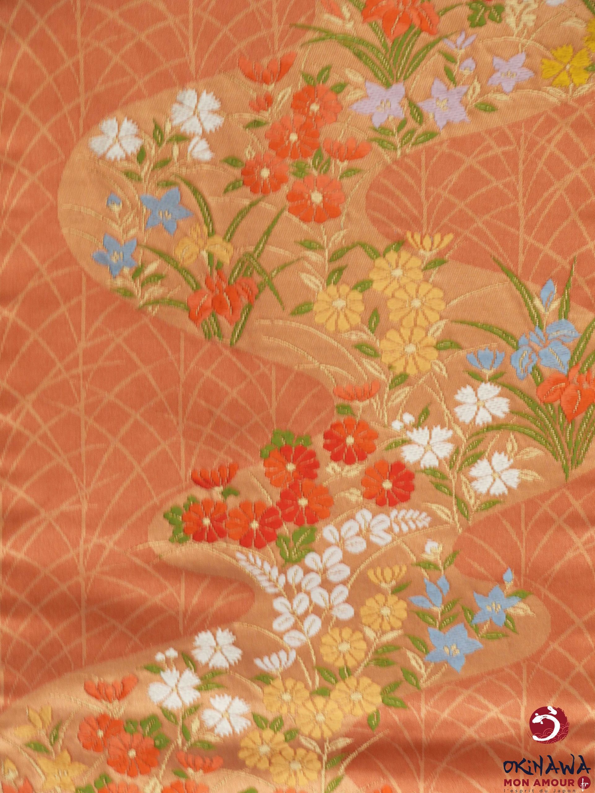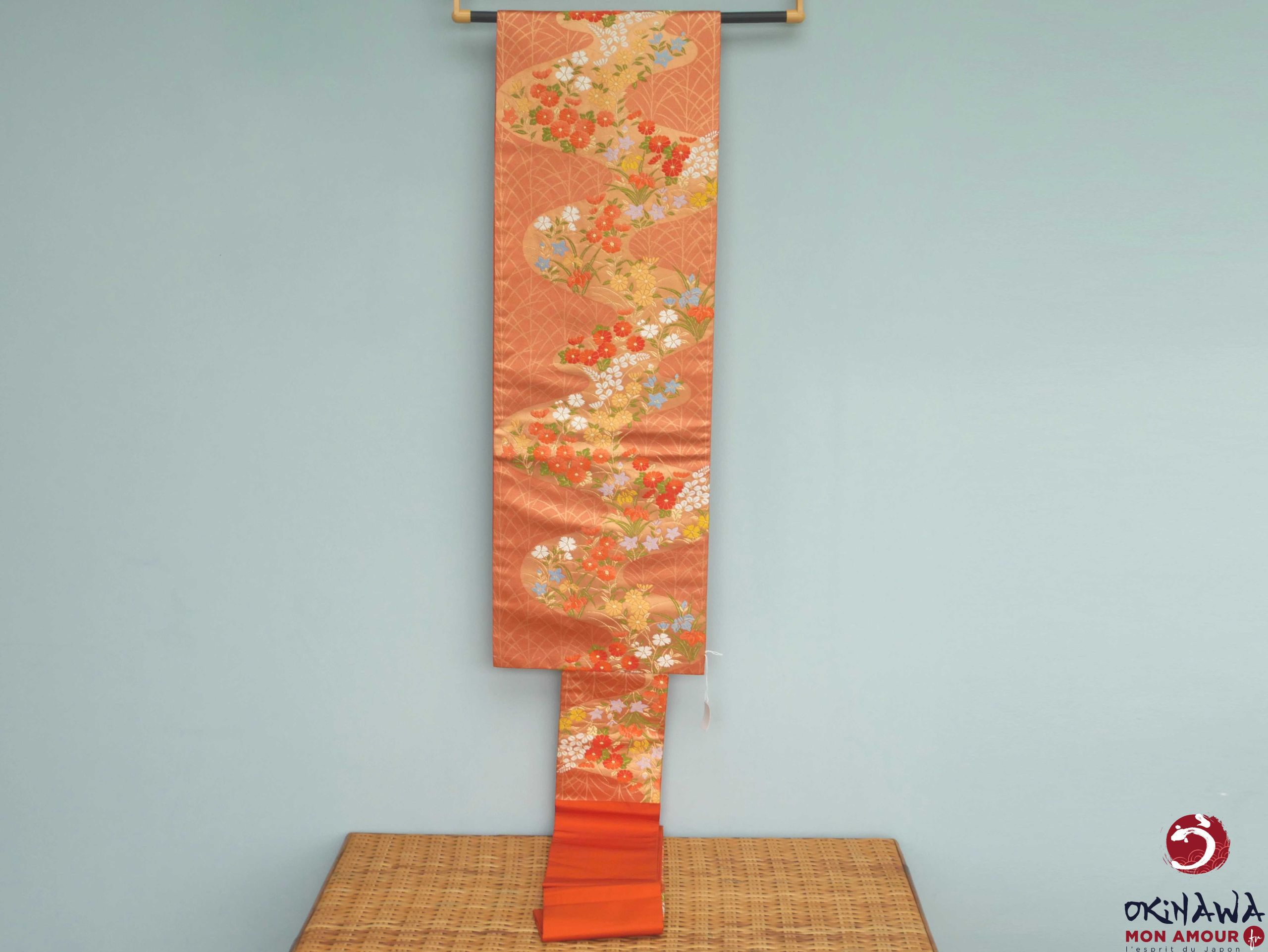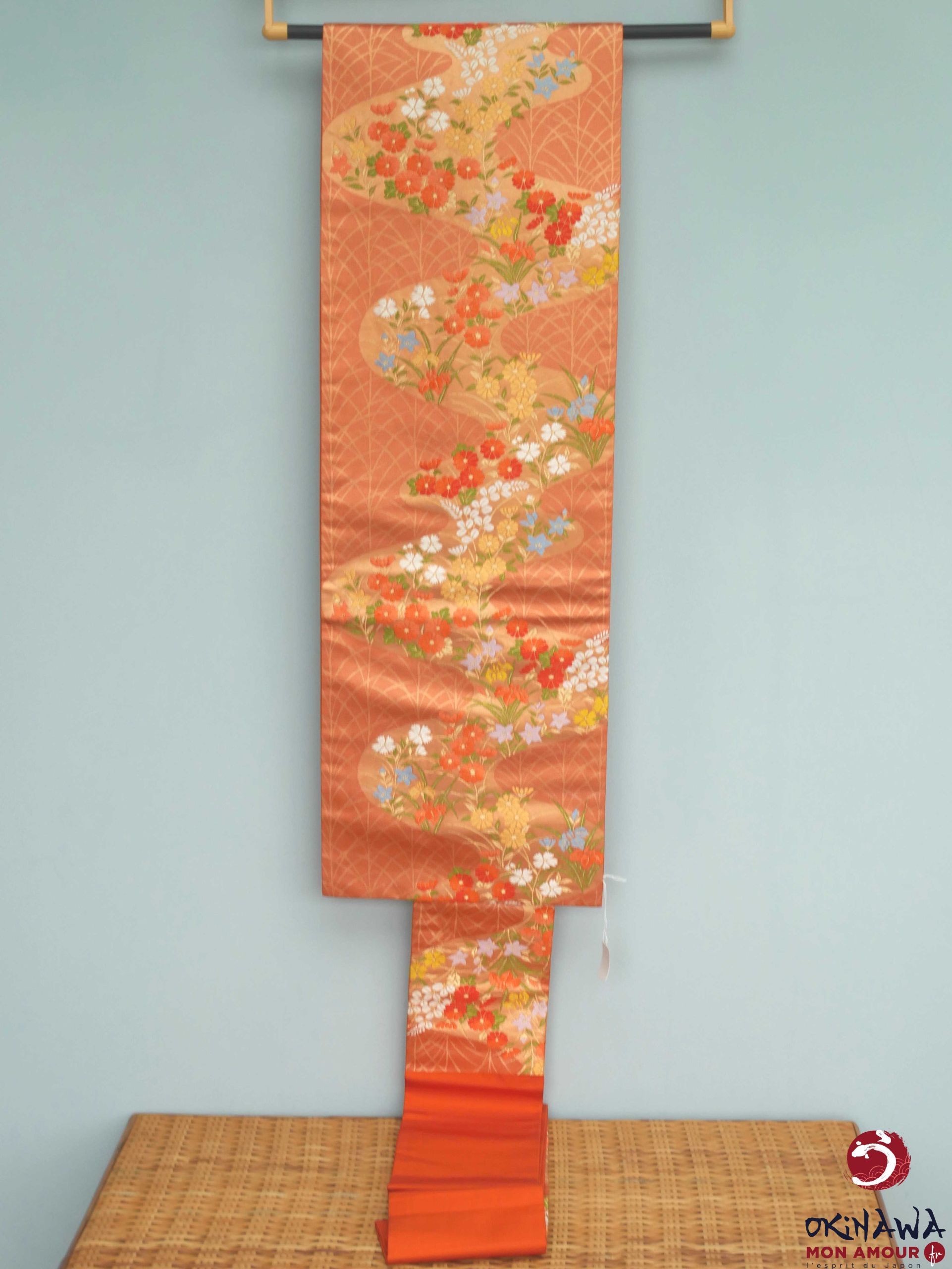 Ceinture de kimono en soie, de type nagoya obi, couleur orange avec des motifs de fleurs des champs de différentes couleurs, coulant comme une rivière.