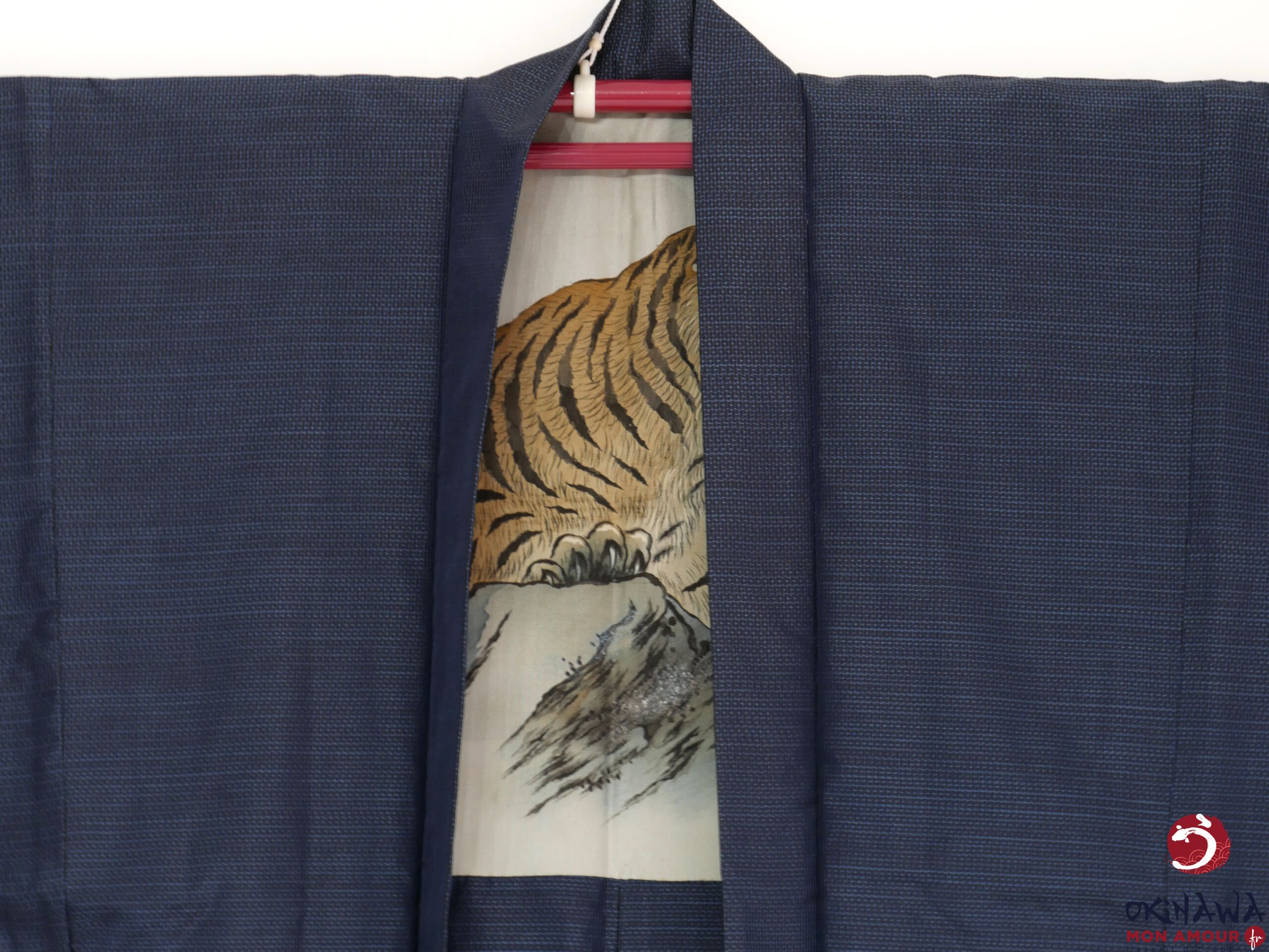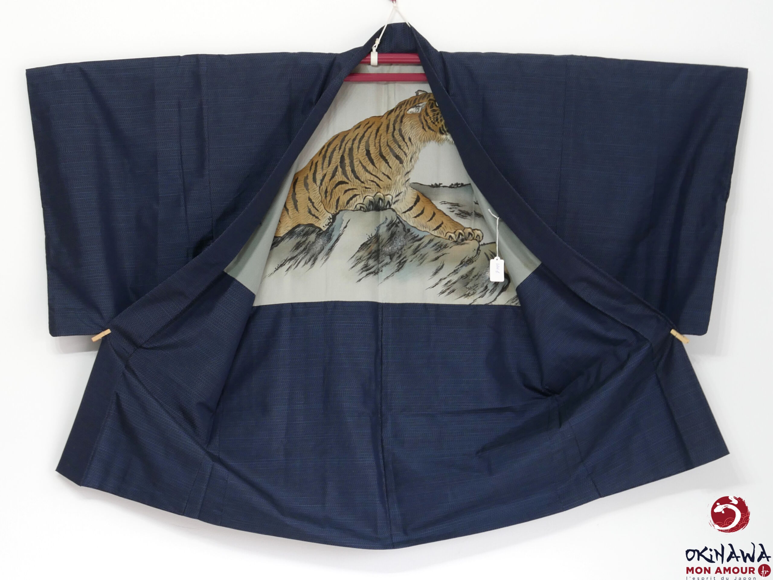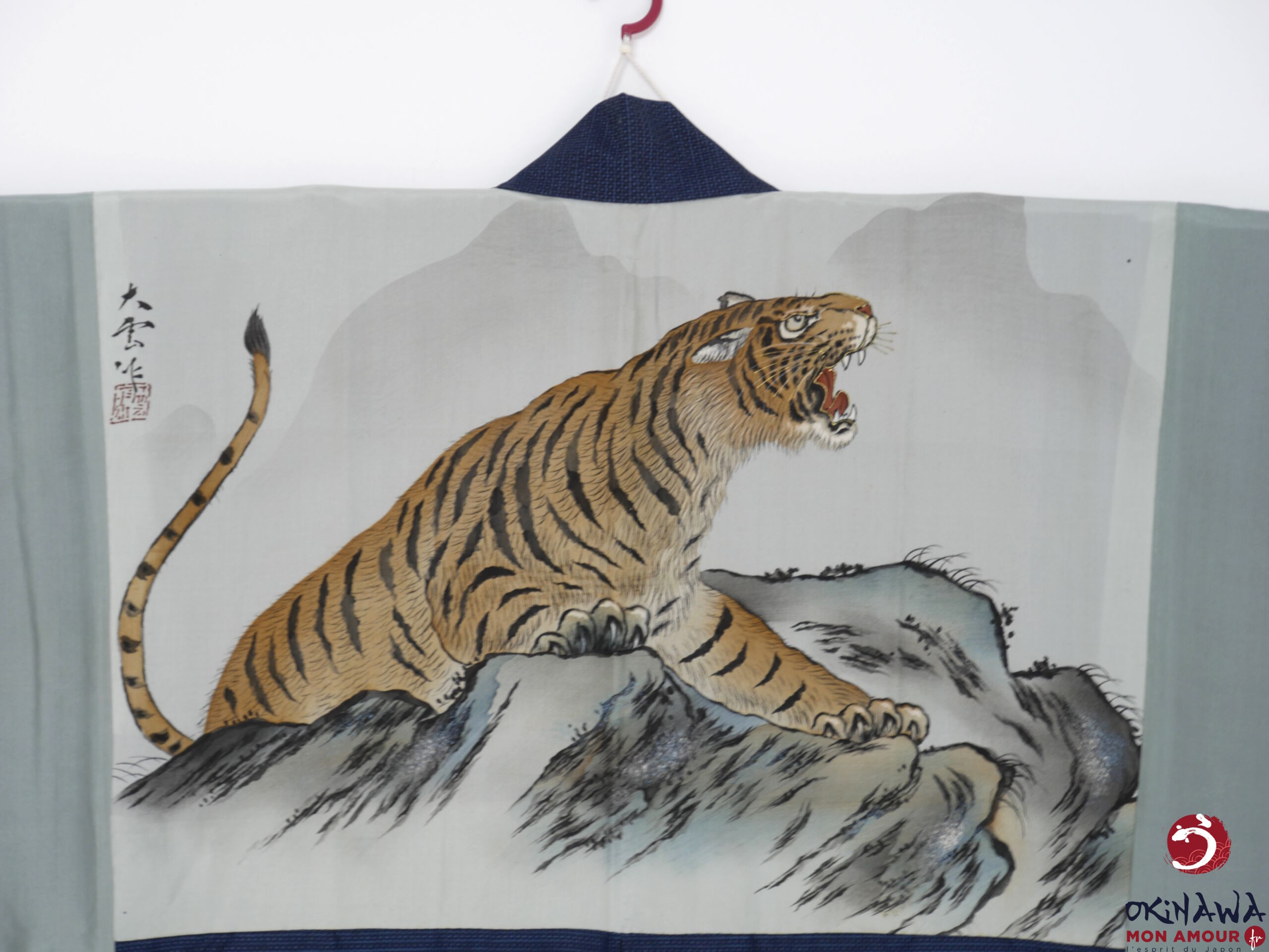 La doublure intérieure est en soie ornée d’un tigre sur des rochers.