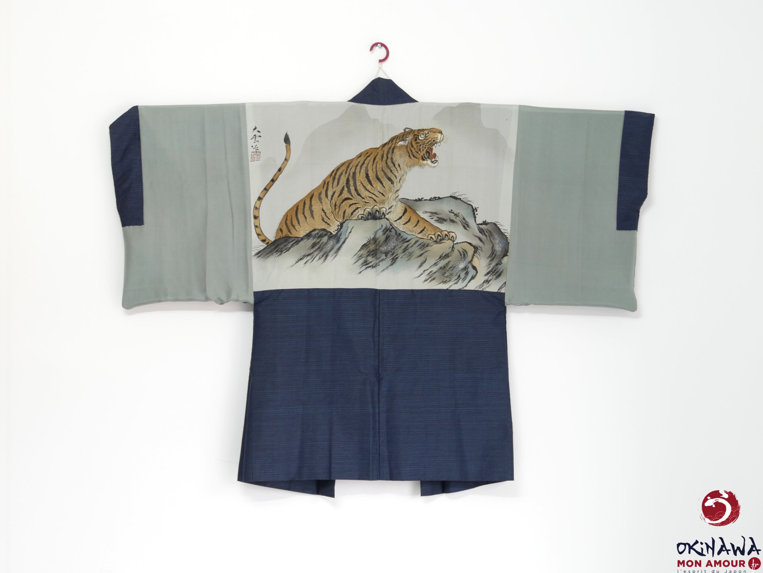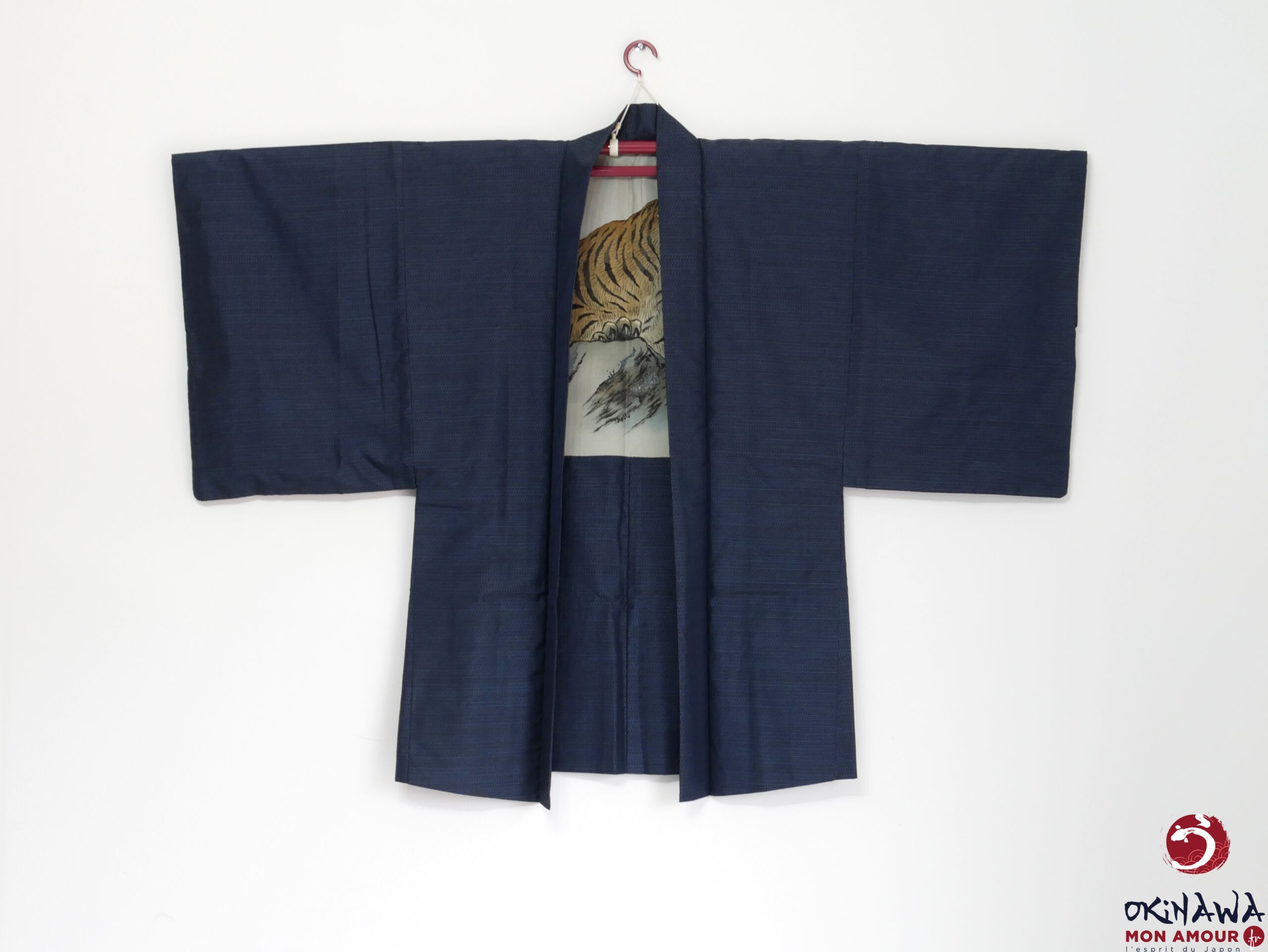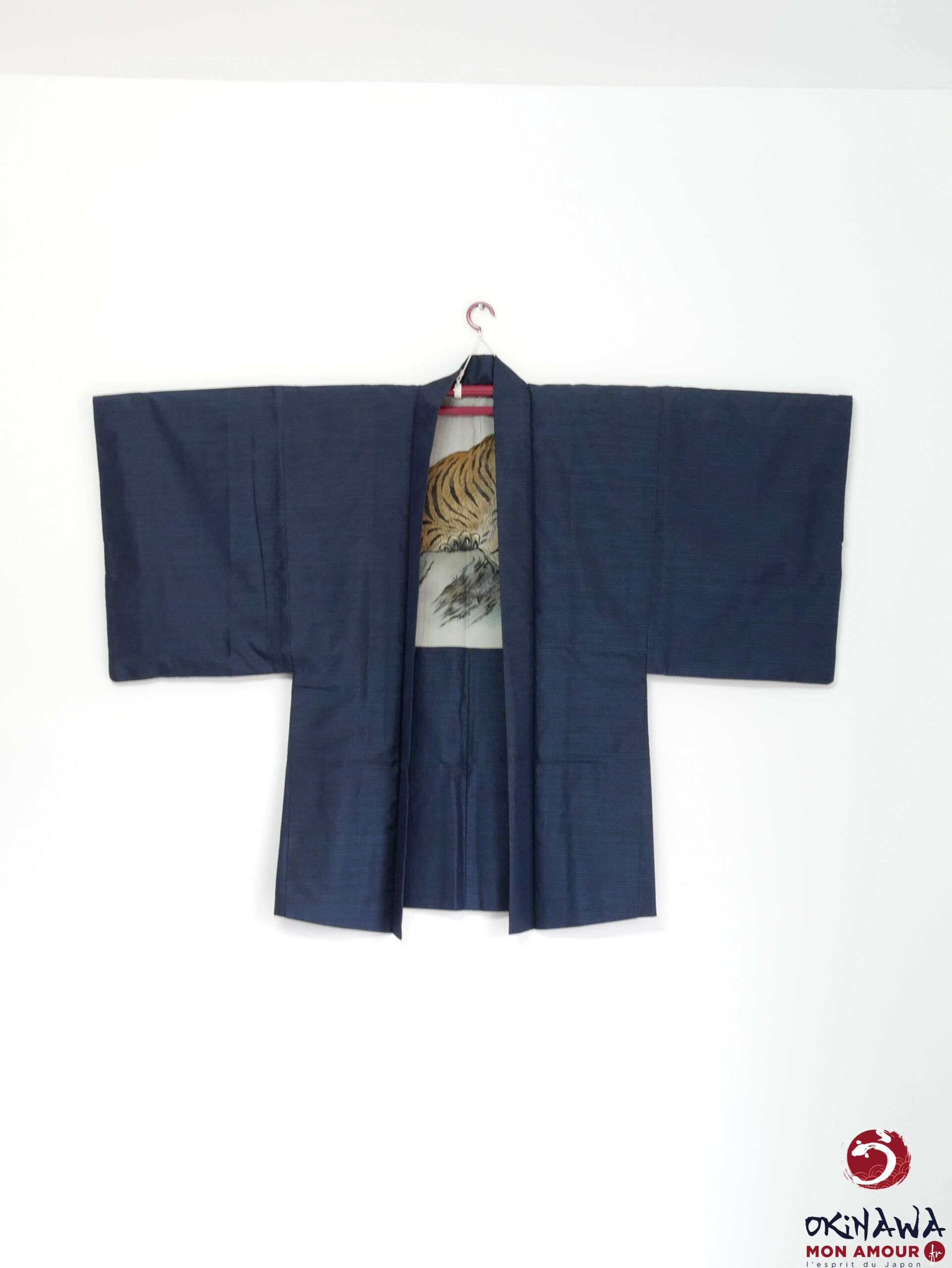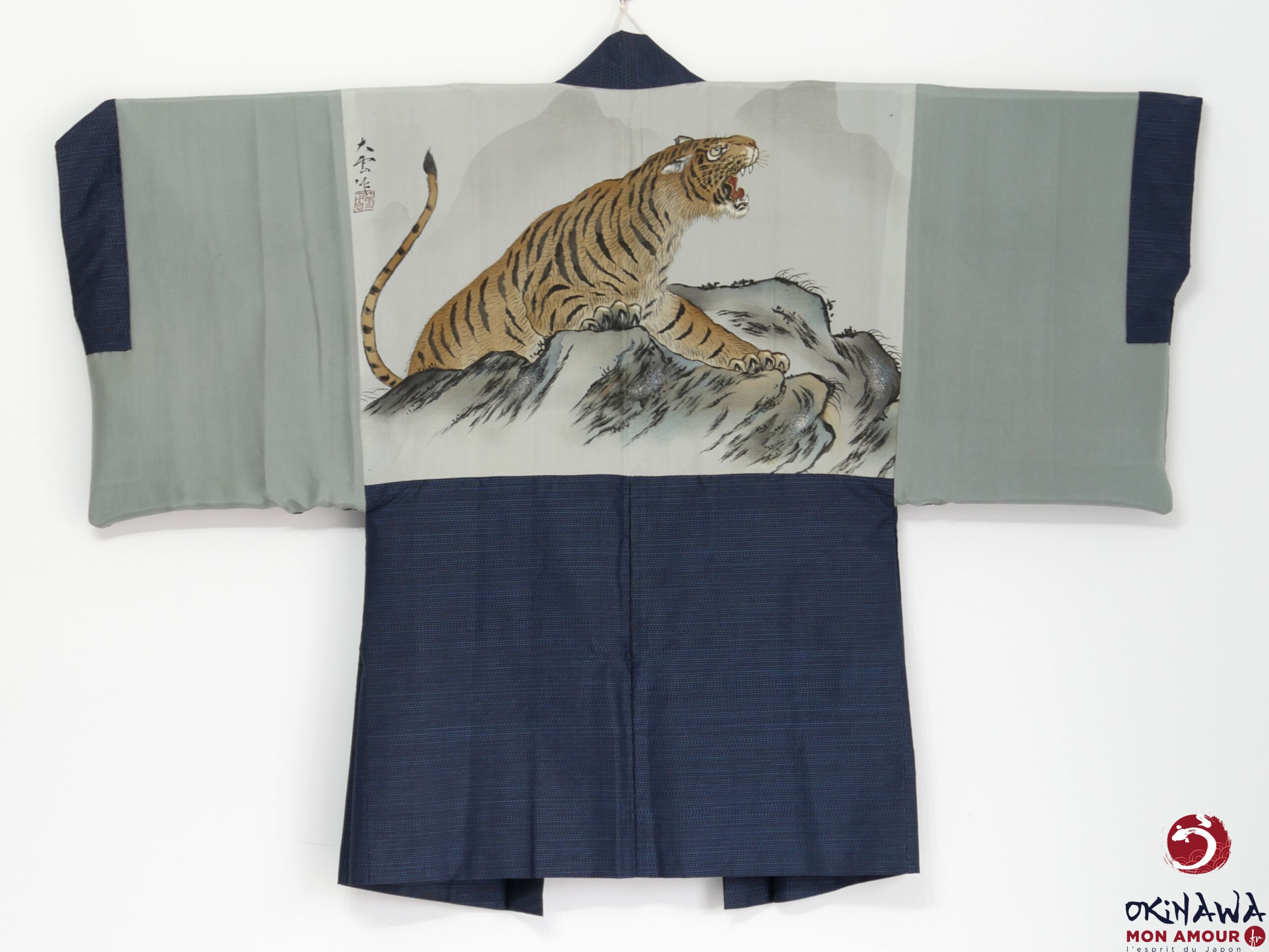 La doublure intérieure est en soie ornée d’un tigre sur des rochers.