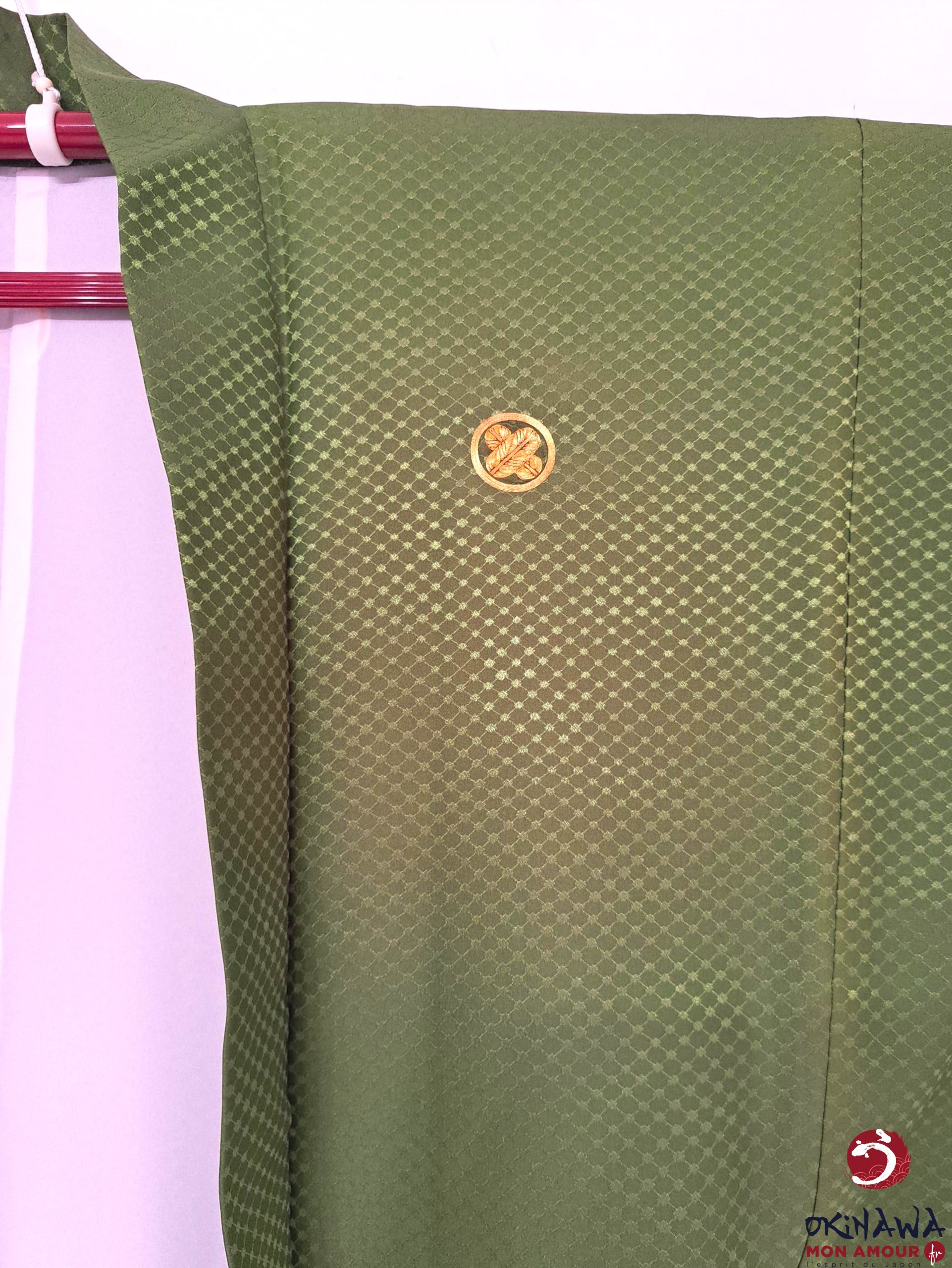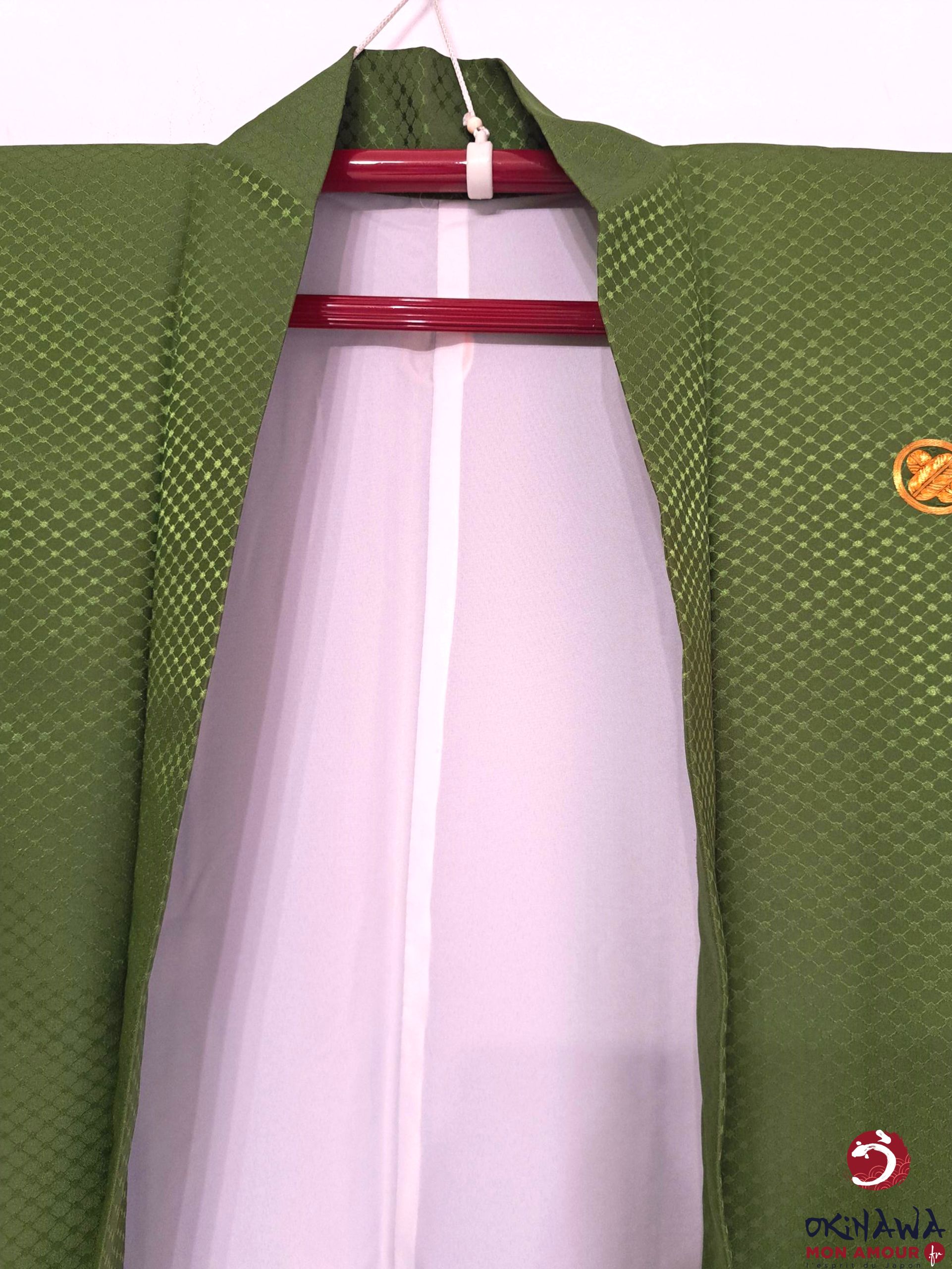 Haori homme japonais traditionnel, vert à motifs en losange en filigrane. Haori très fluide et très léger, très agréable à porter.