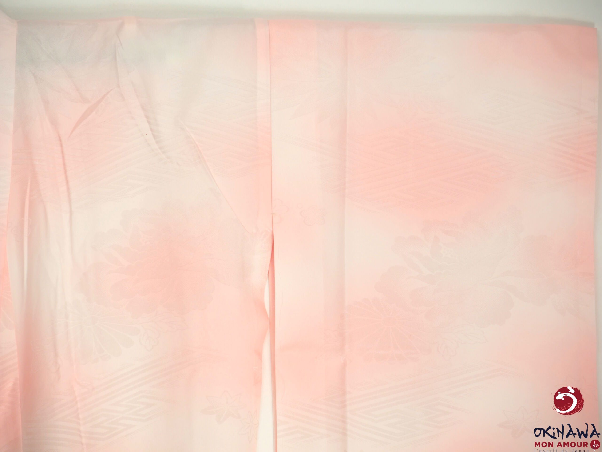 Juban japonais traditionnel rose en soie pour femme, décoré de très nombreuses pivoines et motifs géométriques en filigrane.