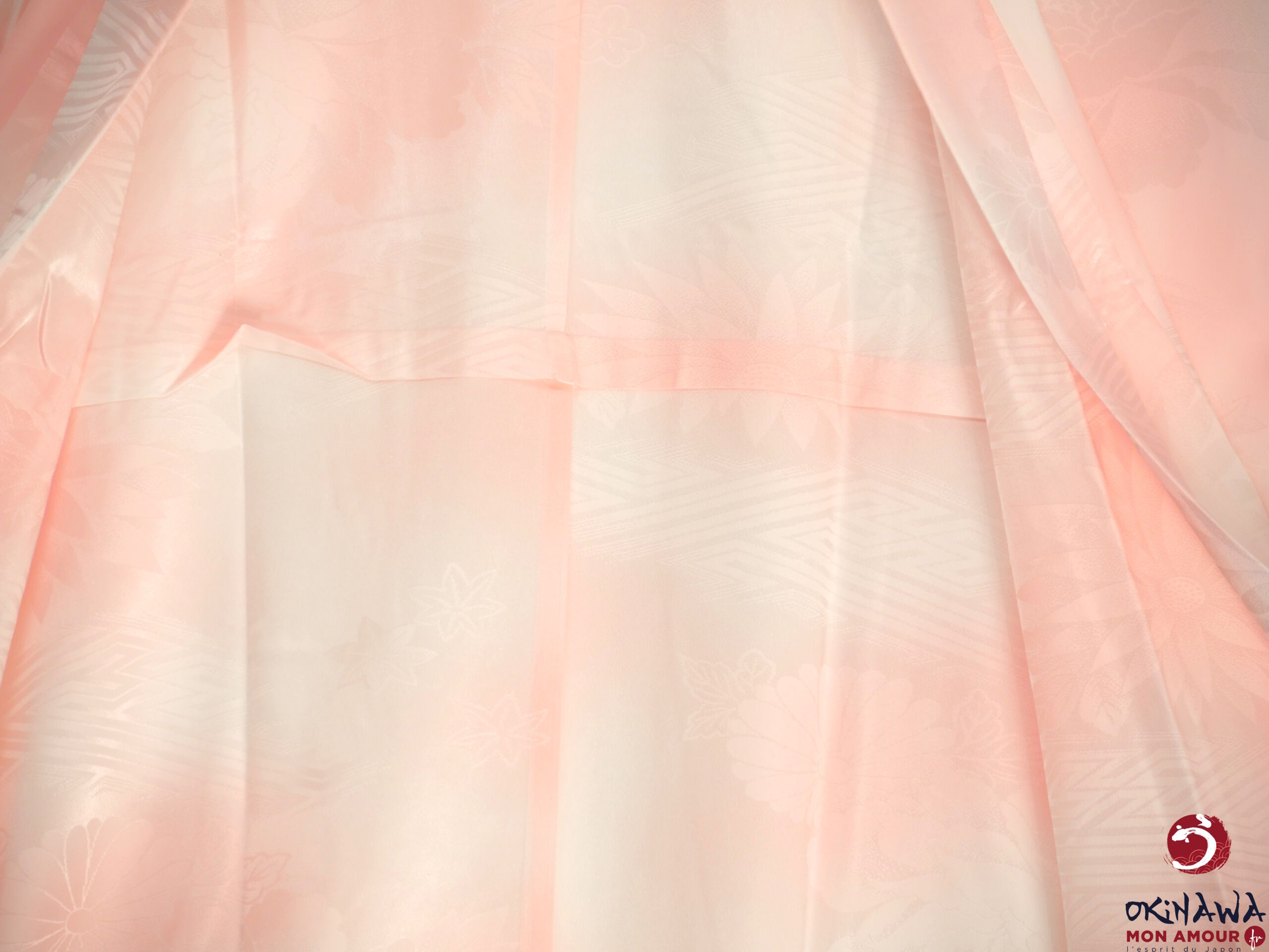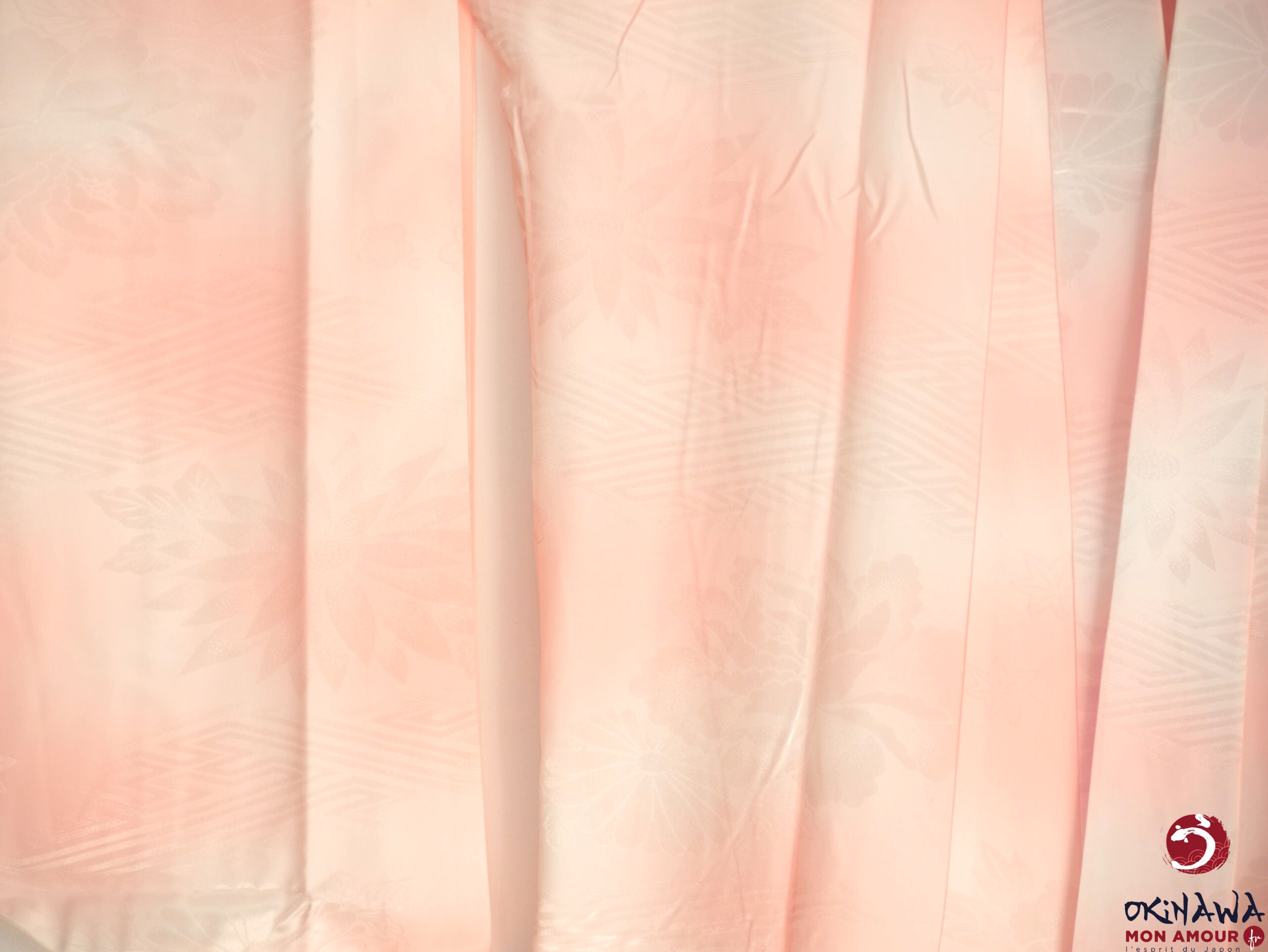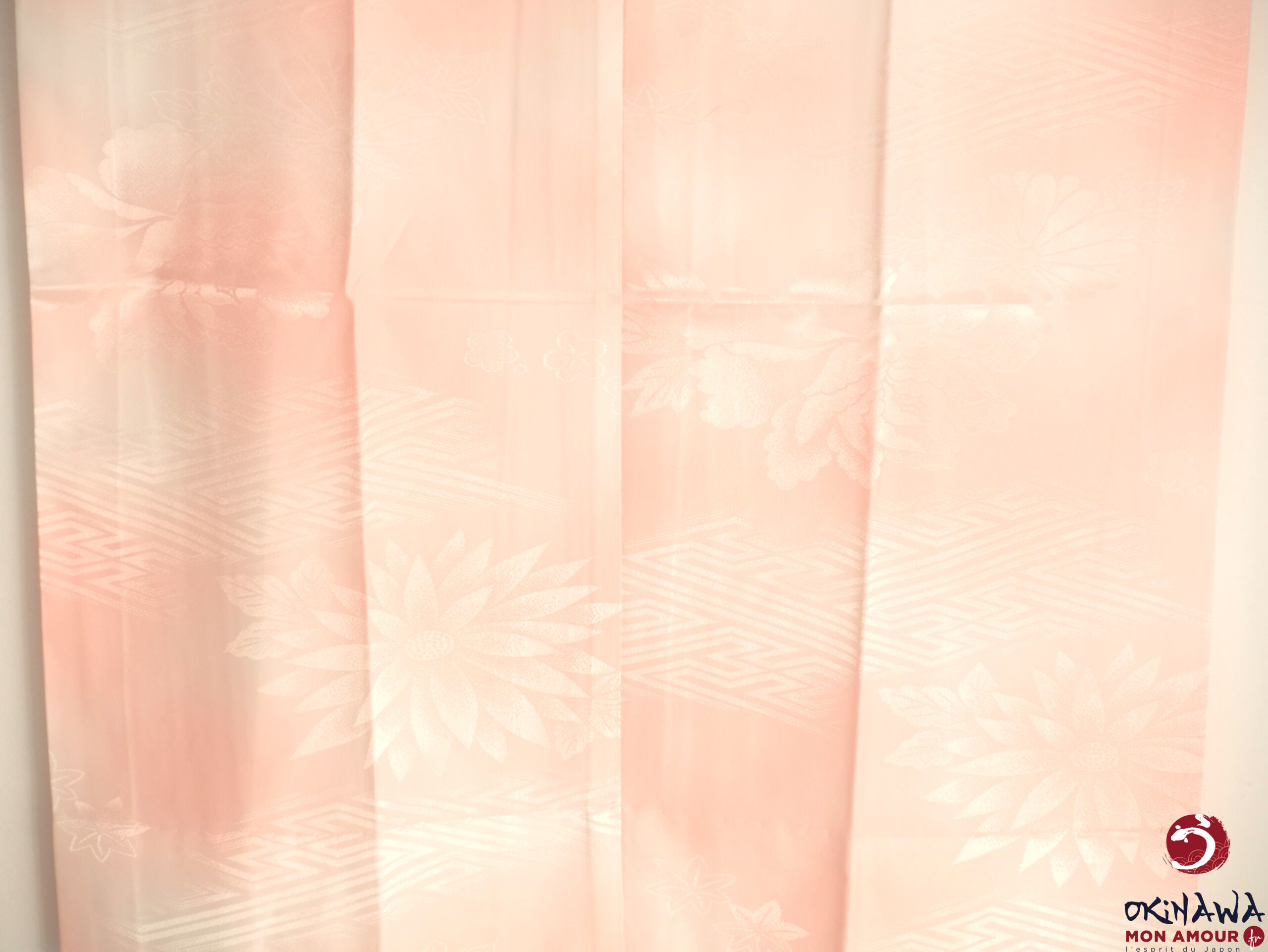 Juban (ou nagajuban) japonais (sous-vêtement de kimono) pour femme, en soie, rose avec des marbrures plus claires, avec des pivoines et des chrysanthèmes et des motifs géométriques en filigrane.