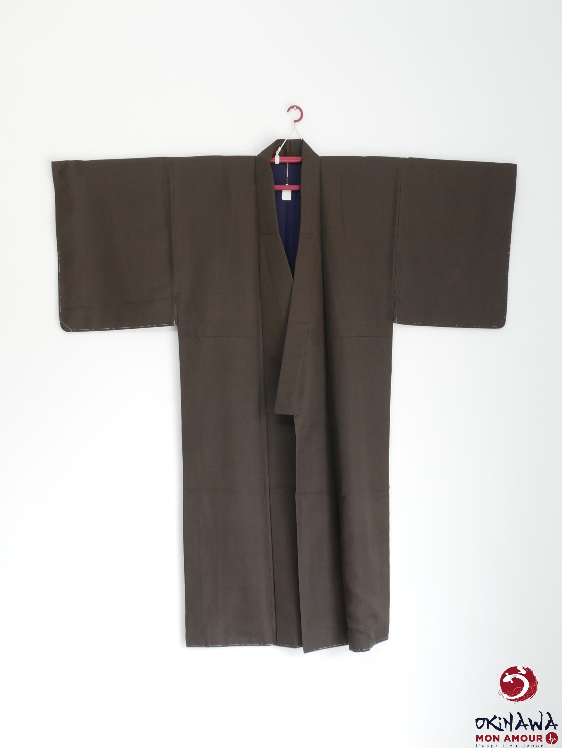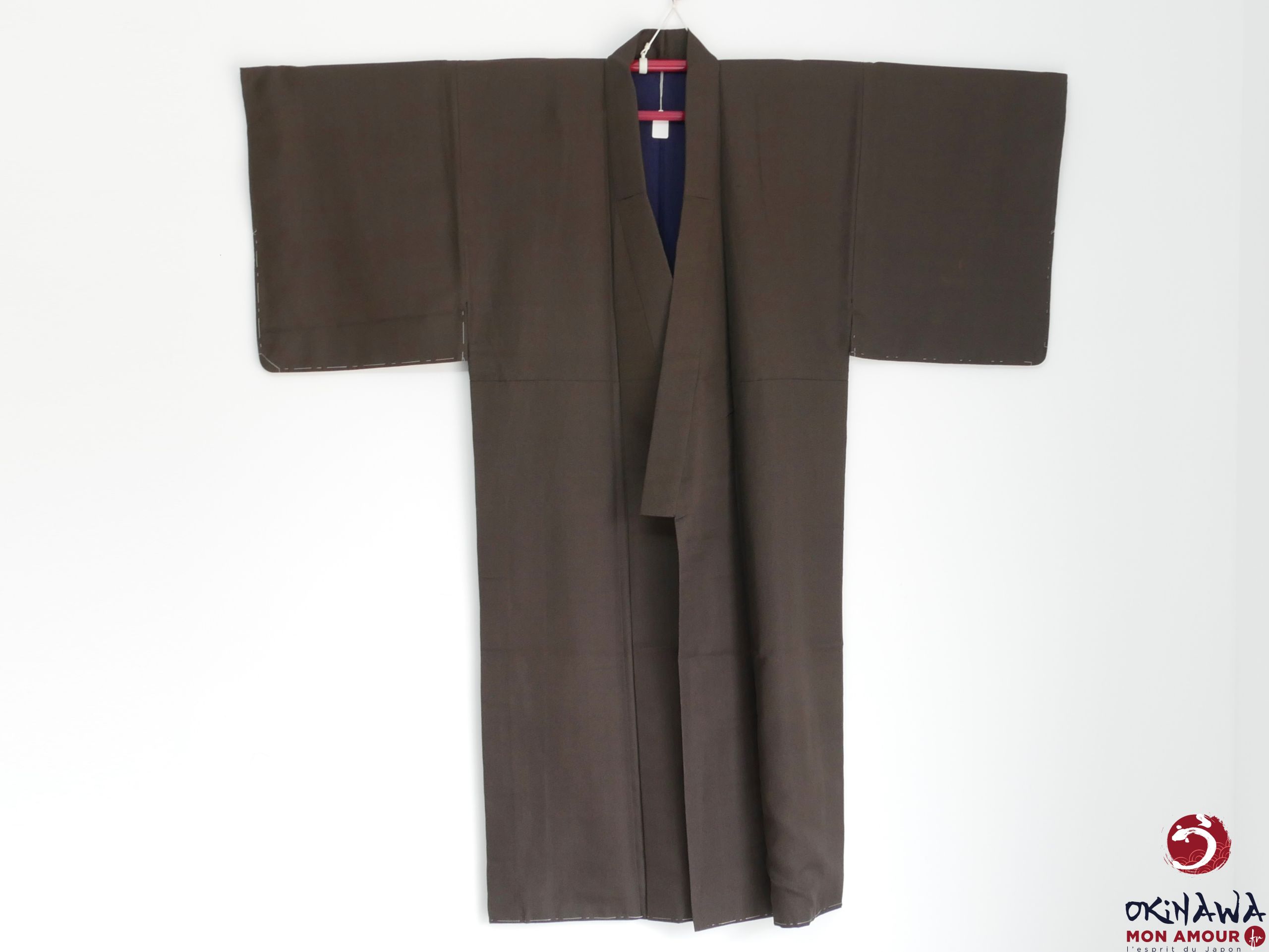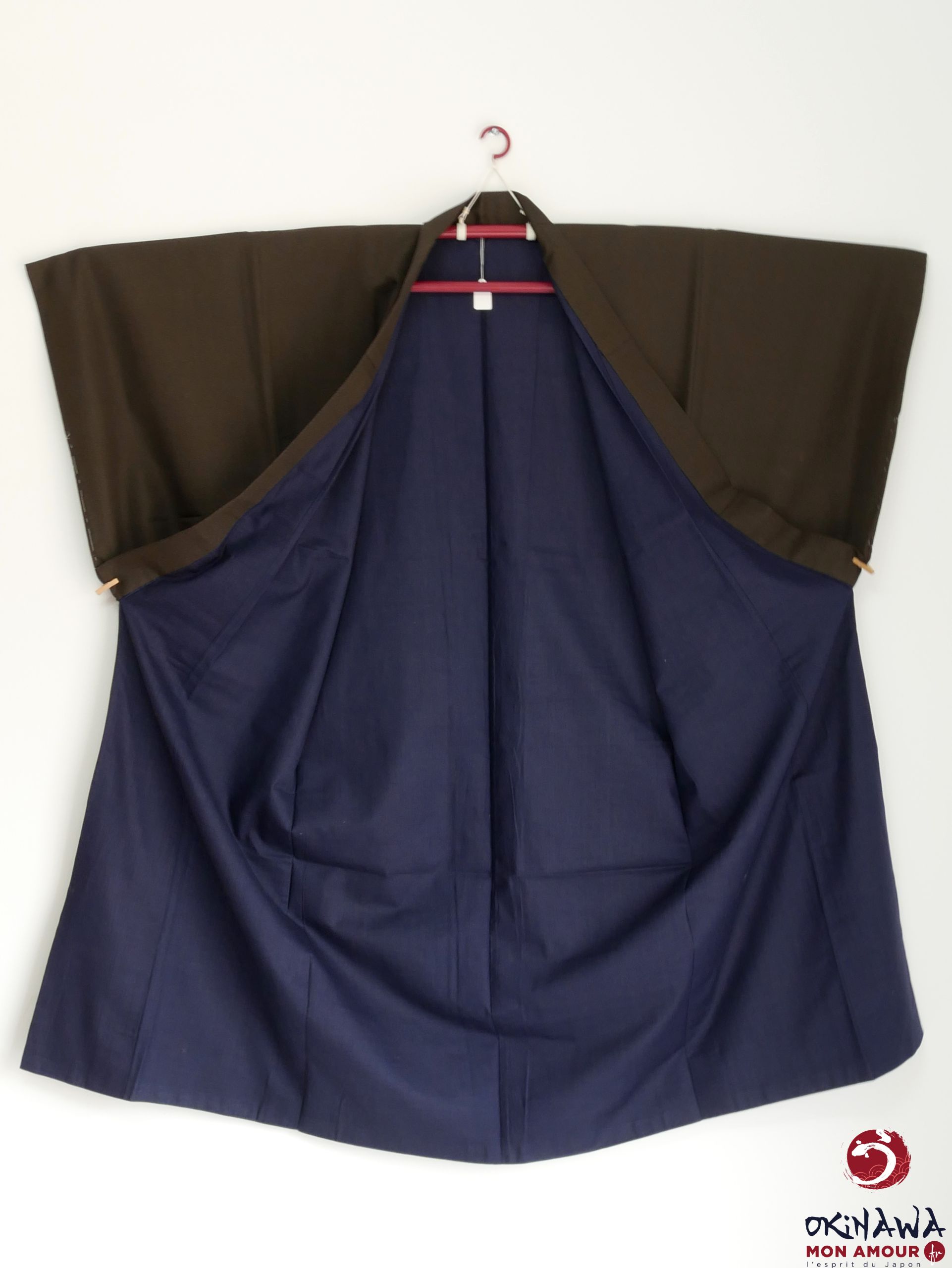 Kimono japonais traditionnel pour homme, marron à motifs d’écorce, en soie, doublure intérieure couleur bleue, longueur 139cm.