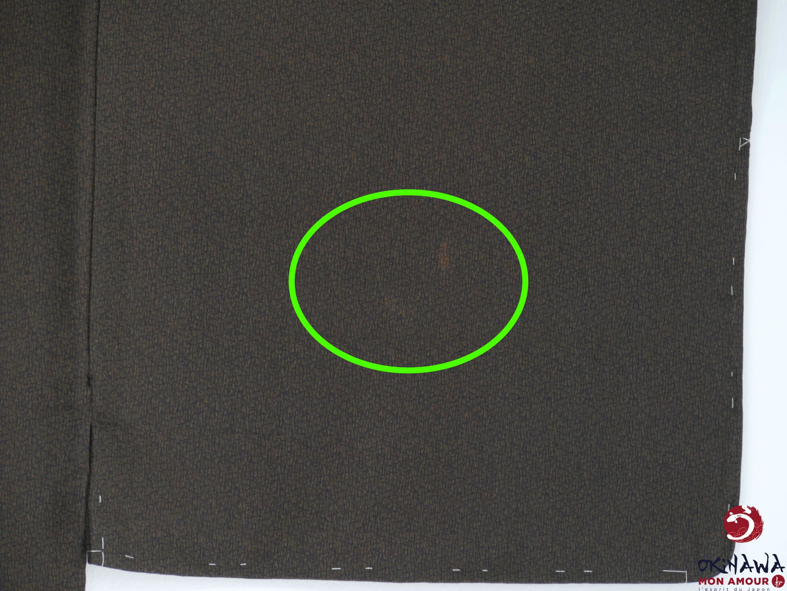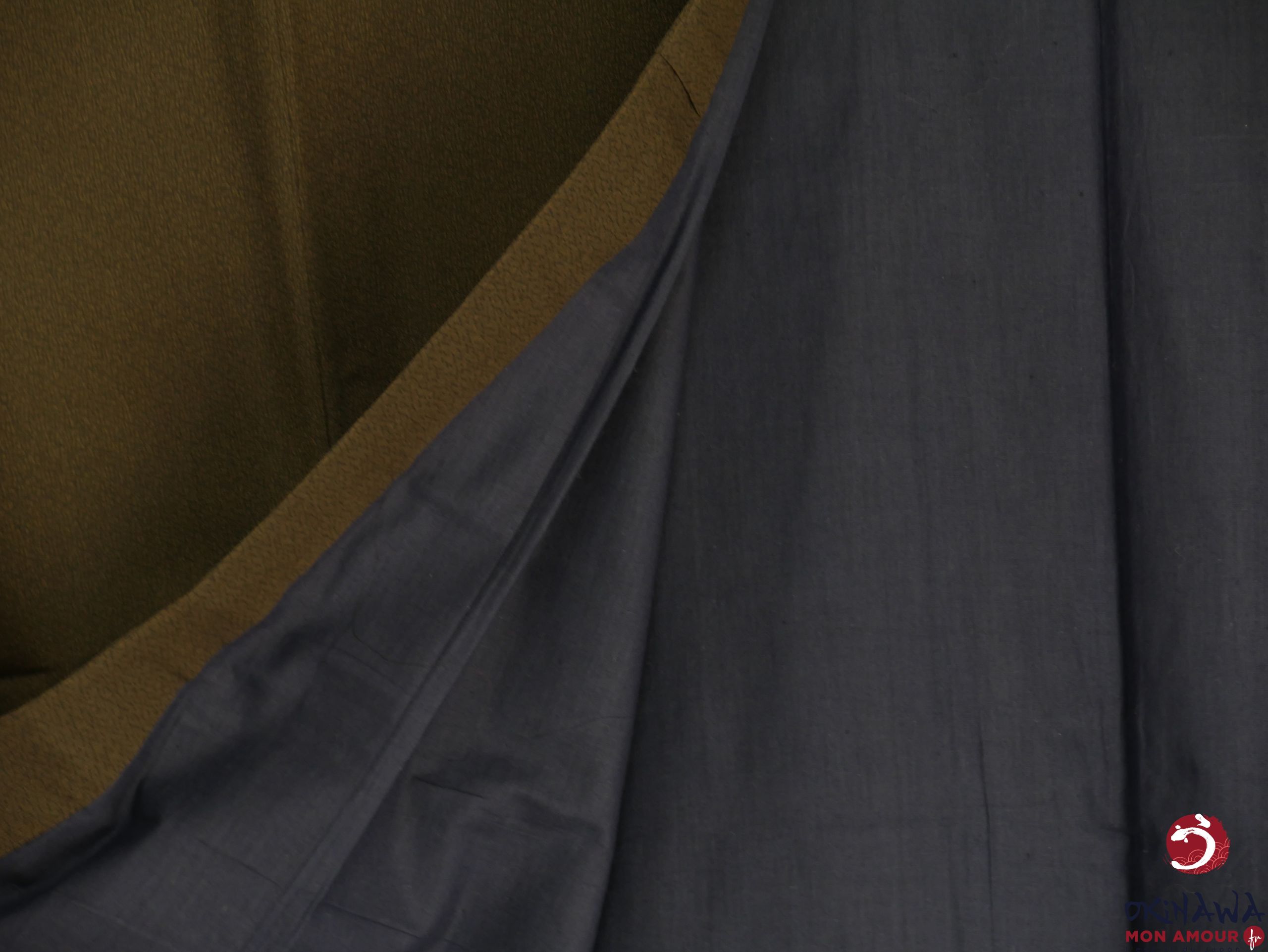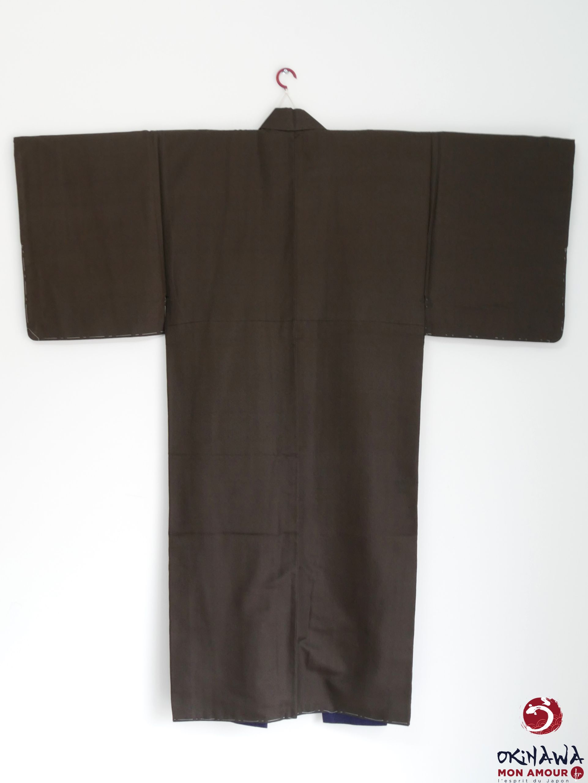 Kimono japonais traditionnel pour homme, marron à motifs d’écorce, en soie, doublure intérieure couleur bleue, longueur 139cm.