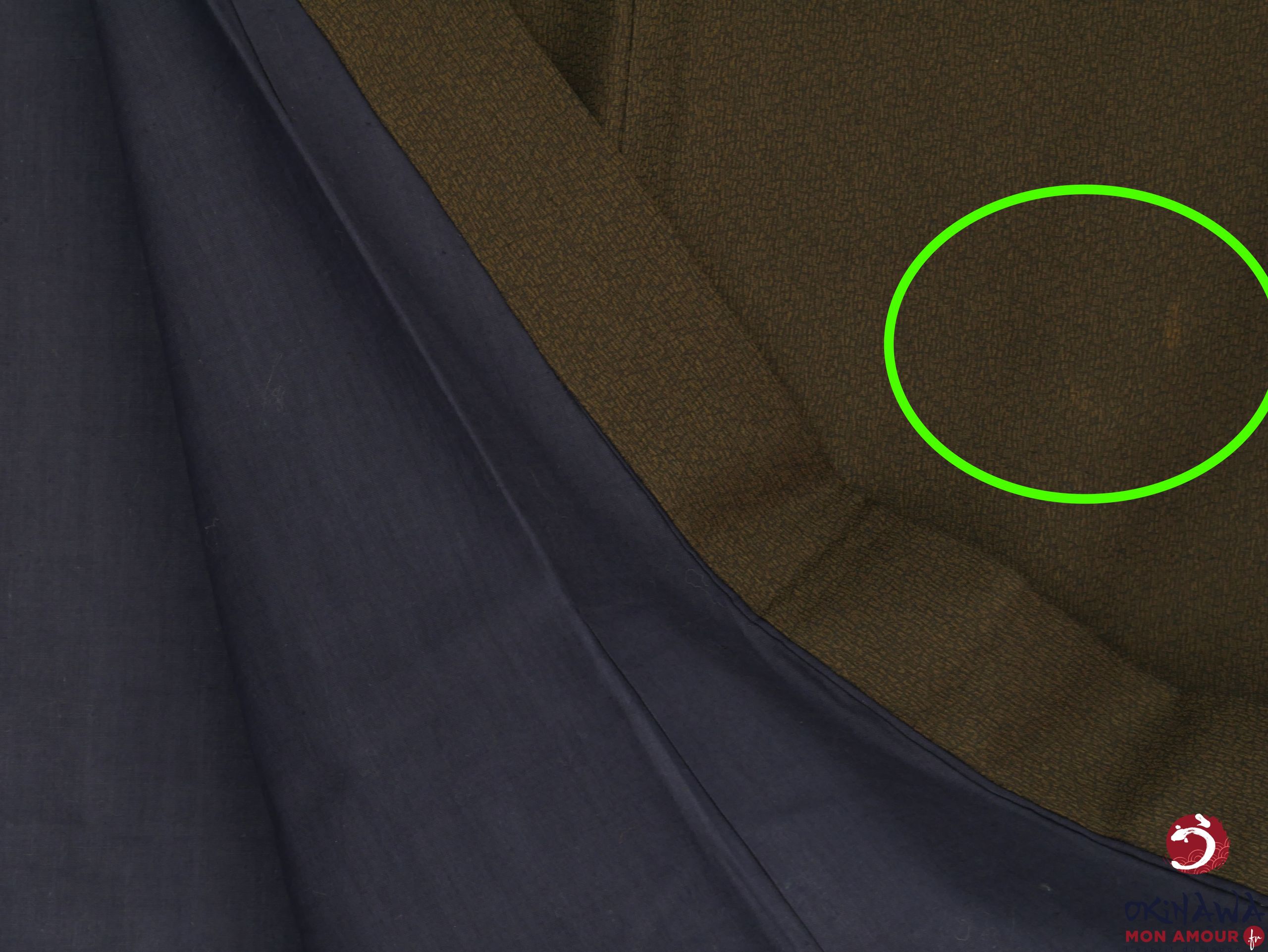 Kimono en très bon état présentant de légères traces d’utilisation et une tâche sur la manche gauche.