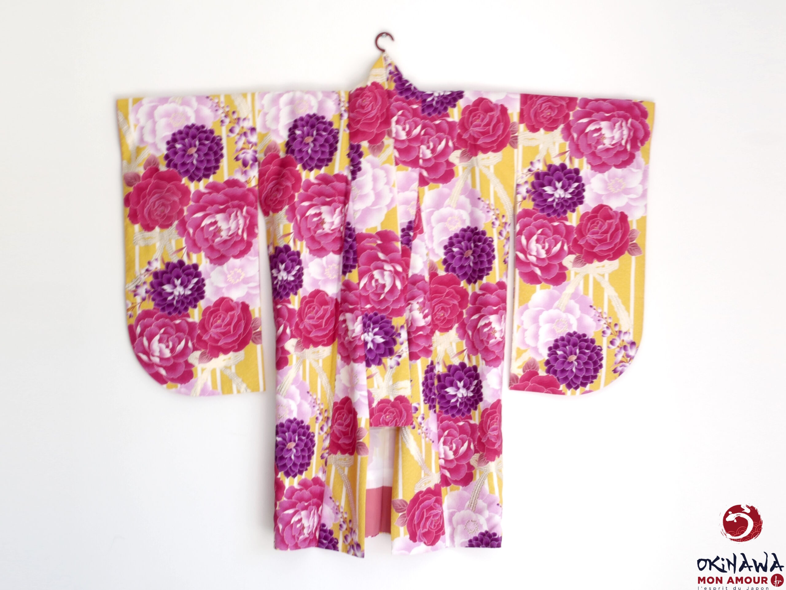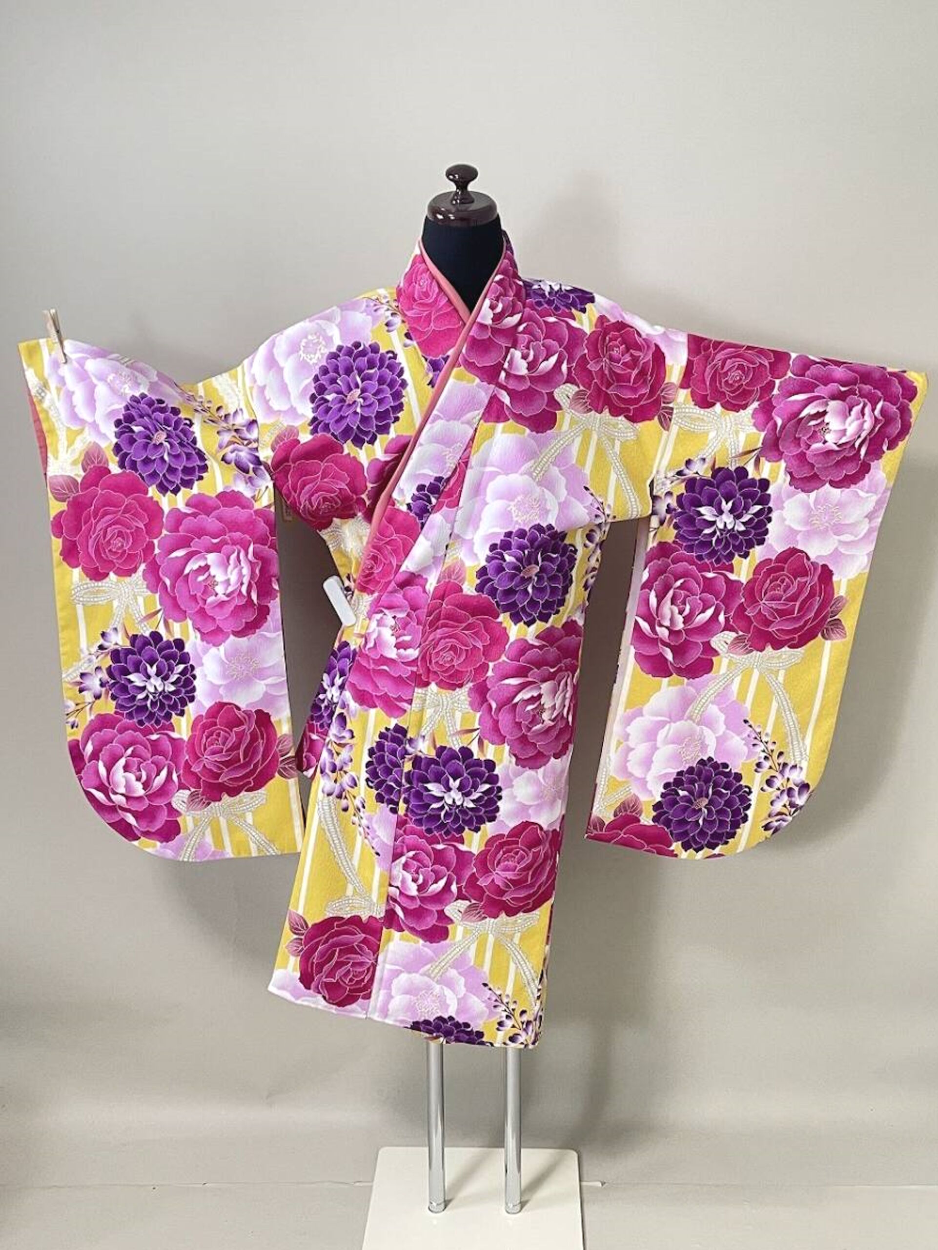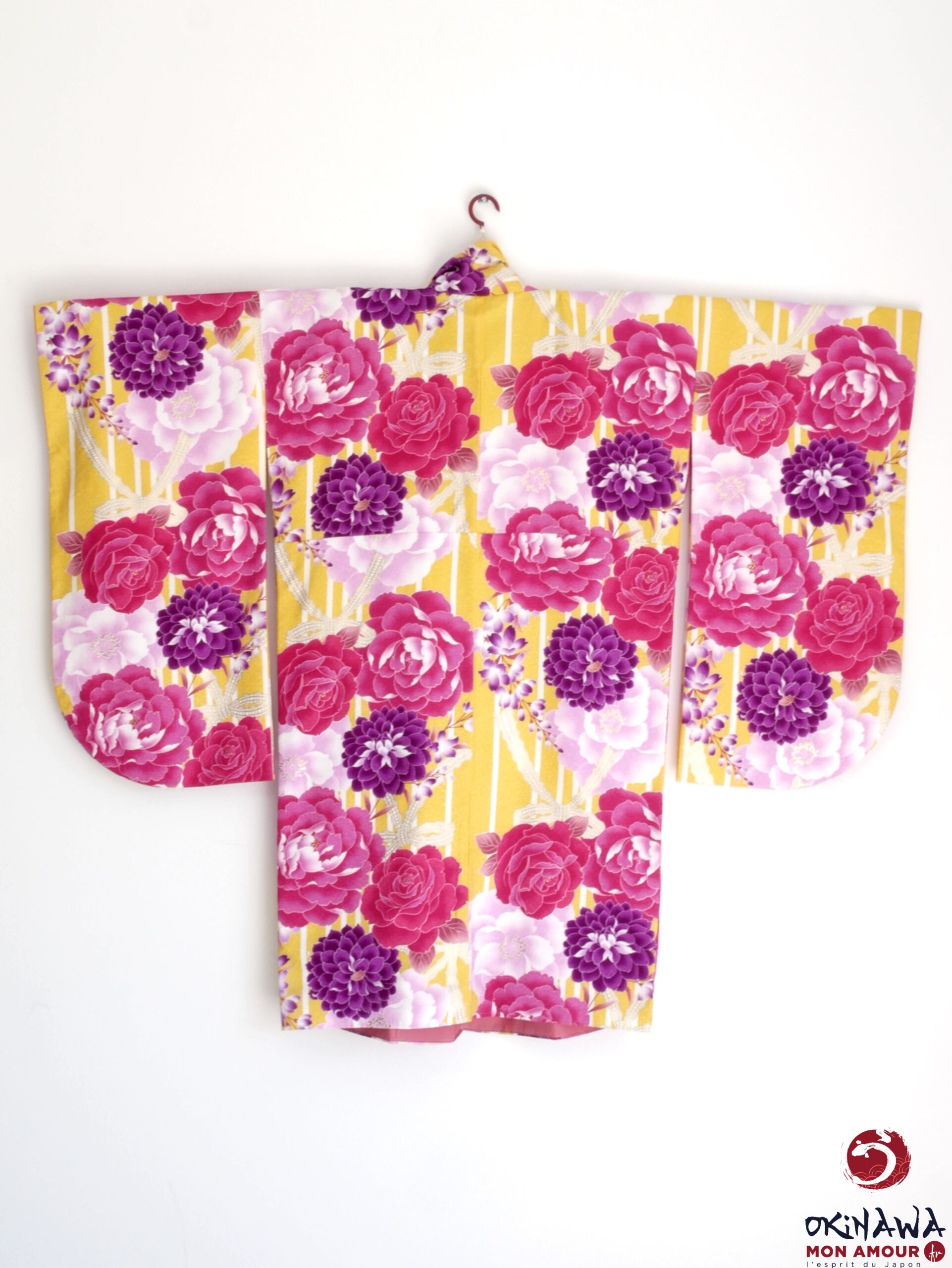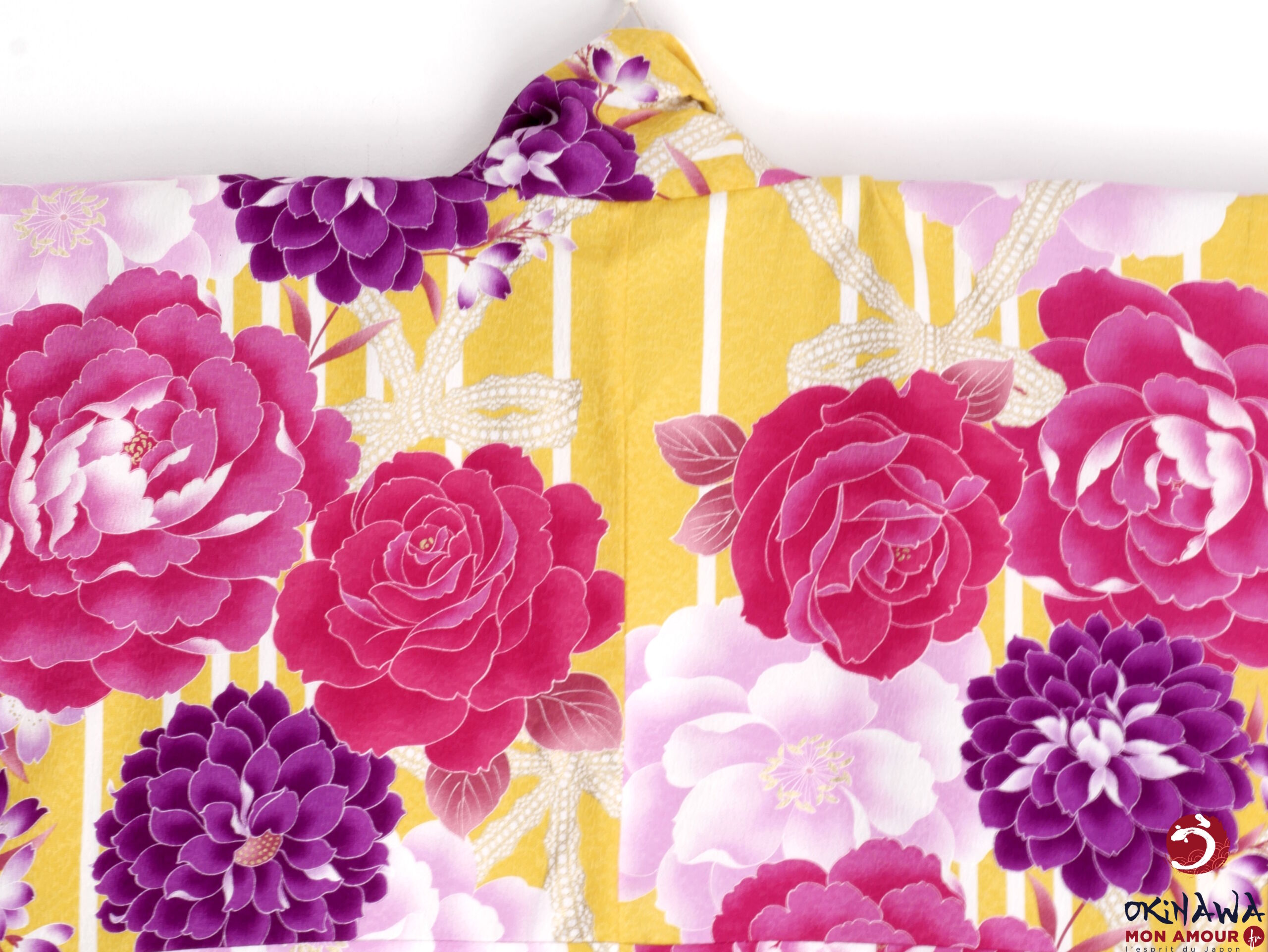 Kimono japonais court et large, moderne, jaune orné d’une multitude de grandes fleurs de rose, d’hortensia et de pivoine, avec des nœuds en dentelle.