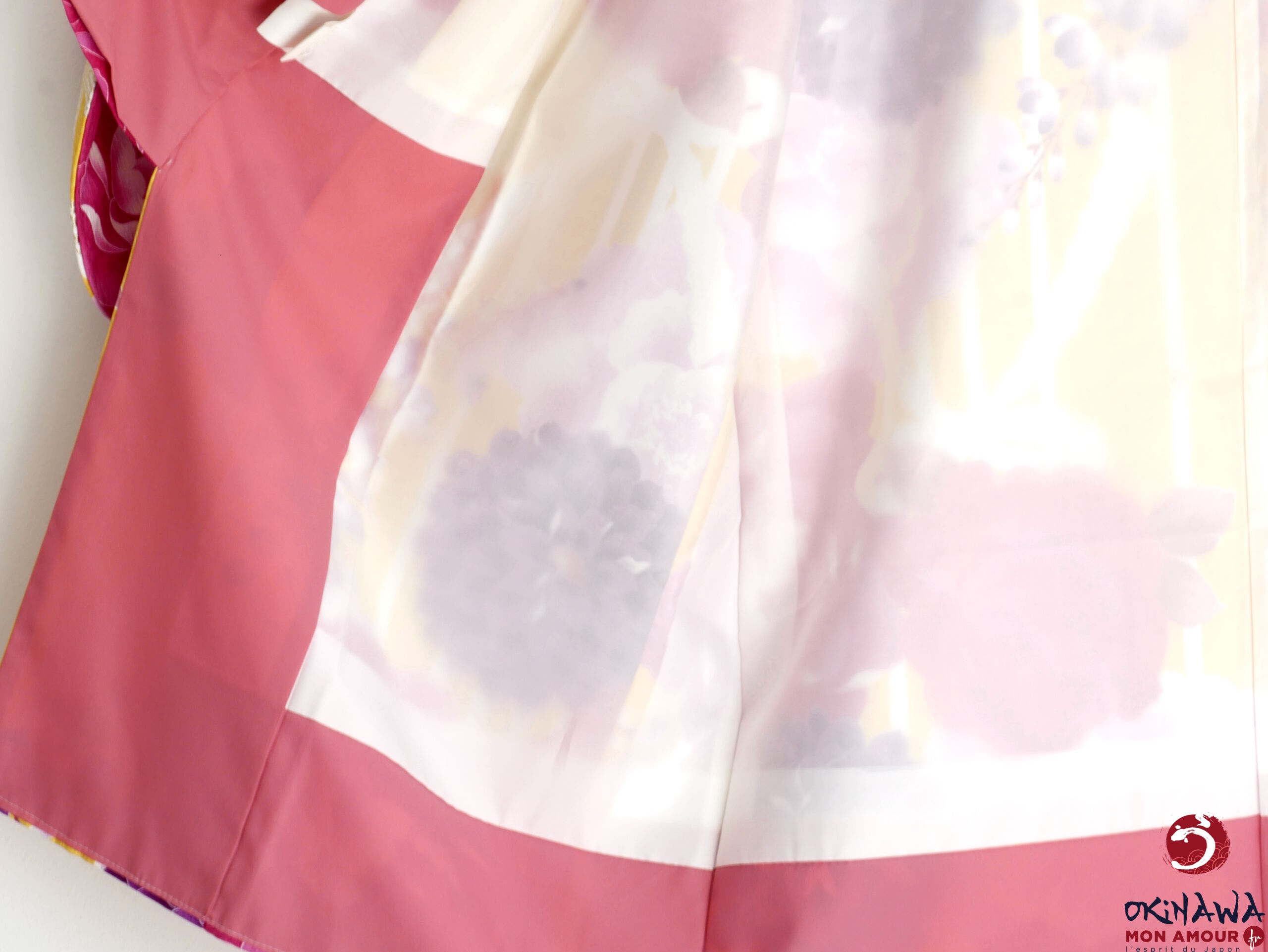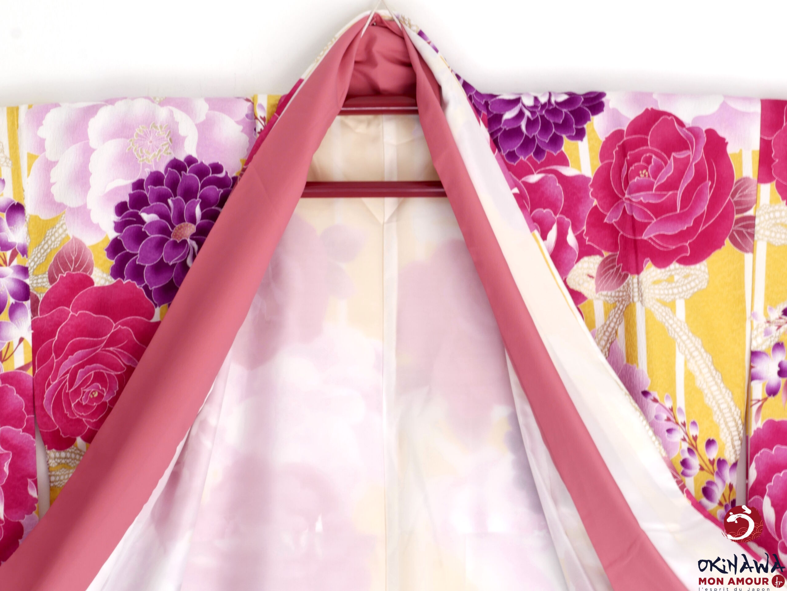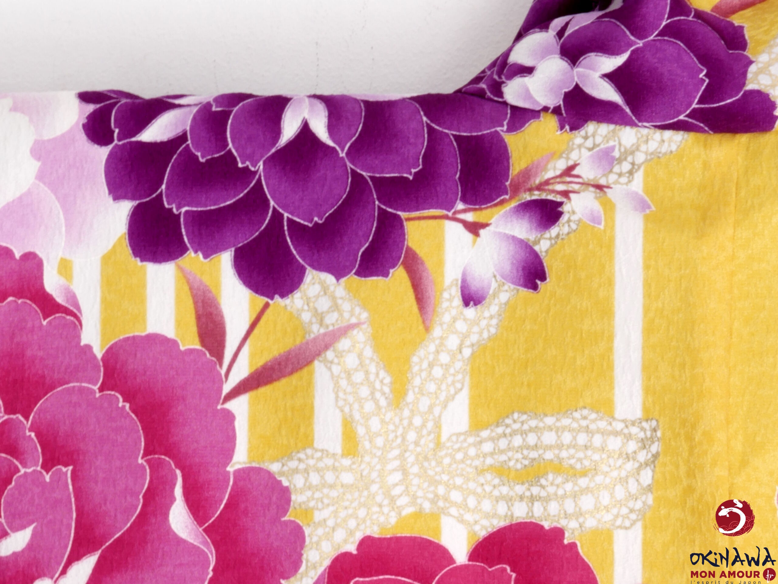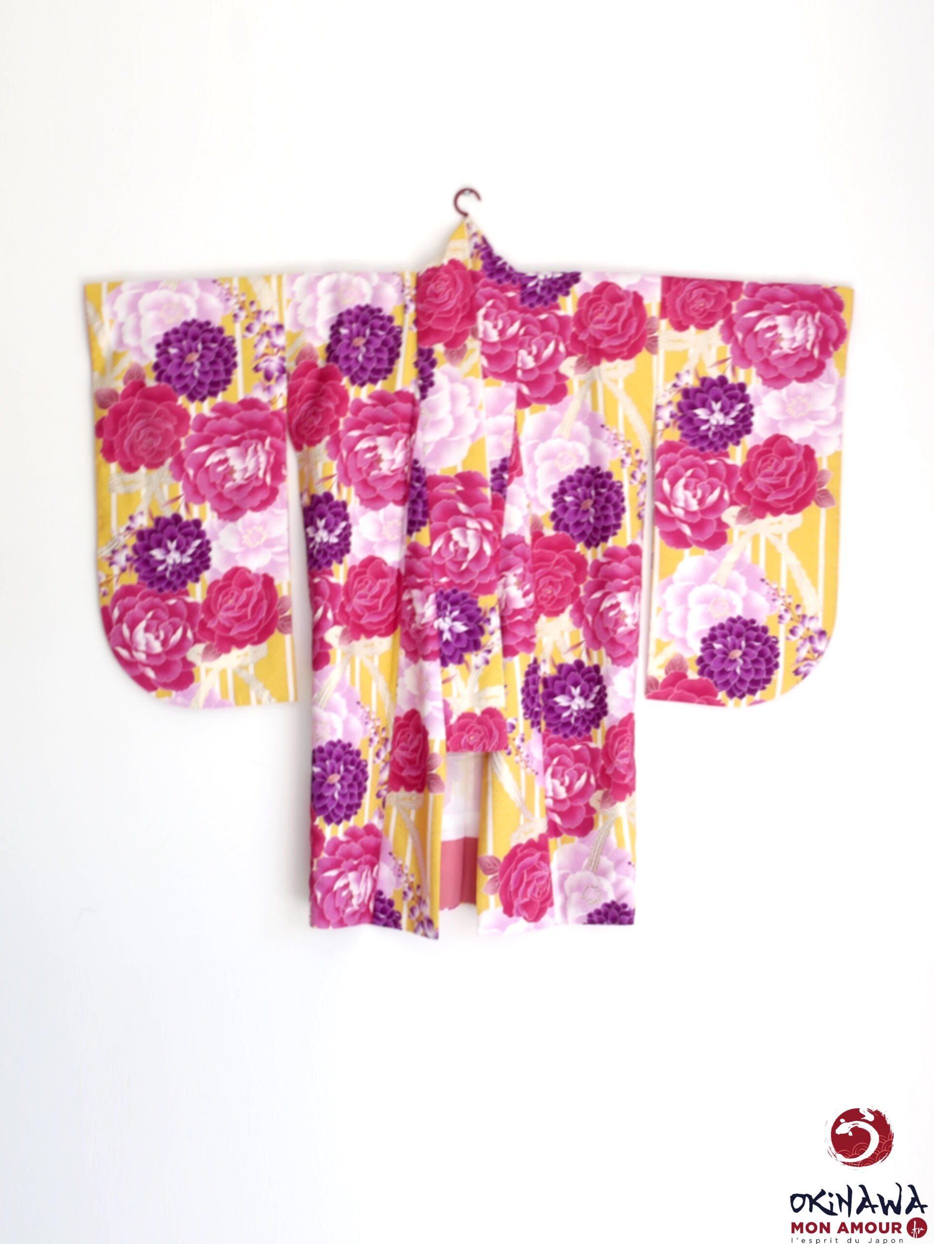 Kimono japonais court et large, moderne, jaune orné d’une multitude de grandes fleurs de rose, d’hortensia et de pivoine, avec des nœuds en dentelle.