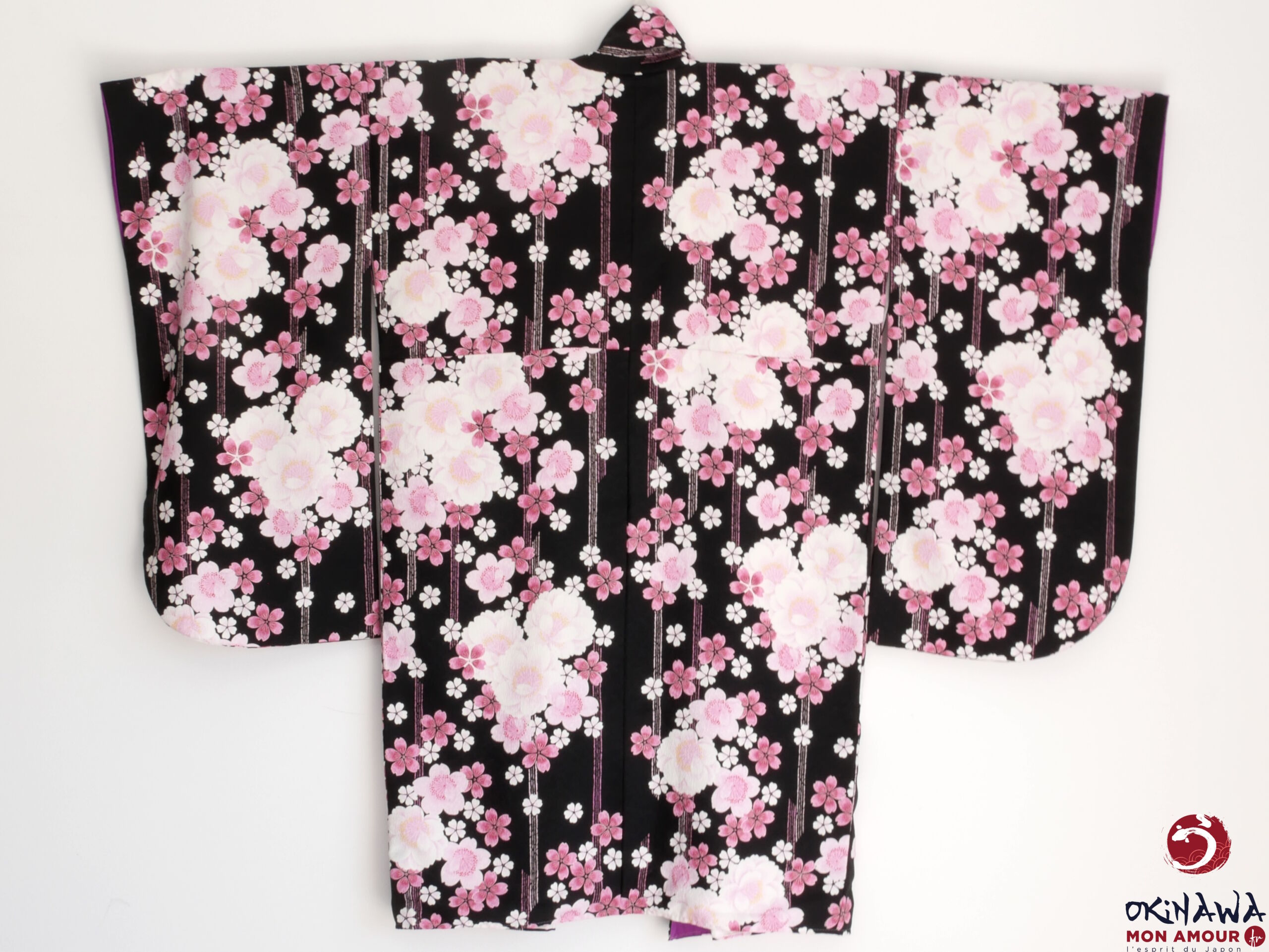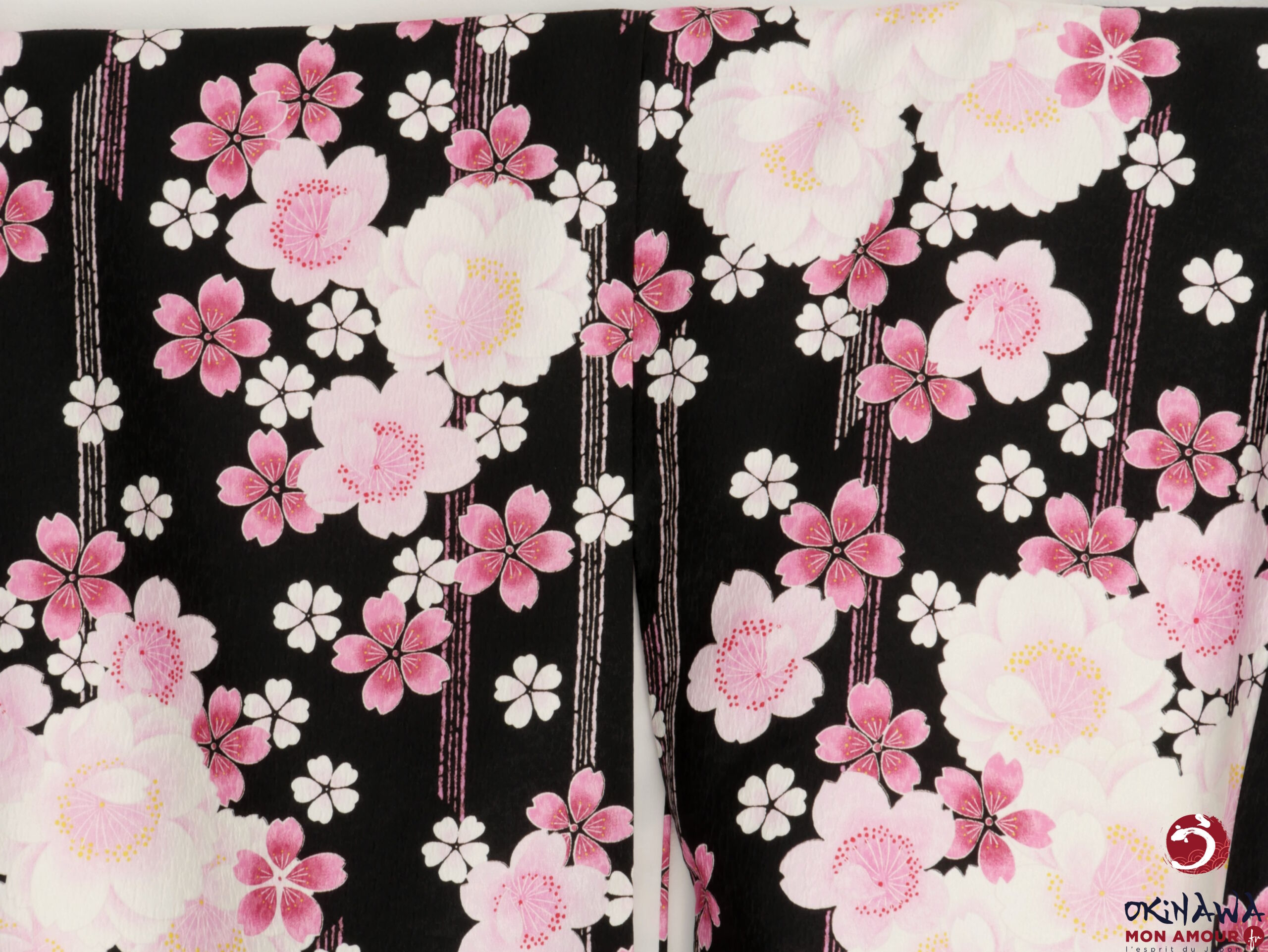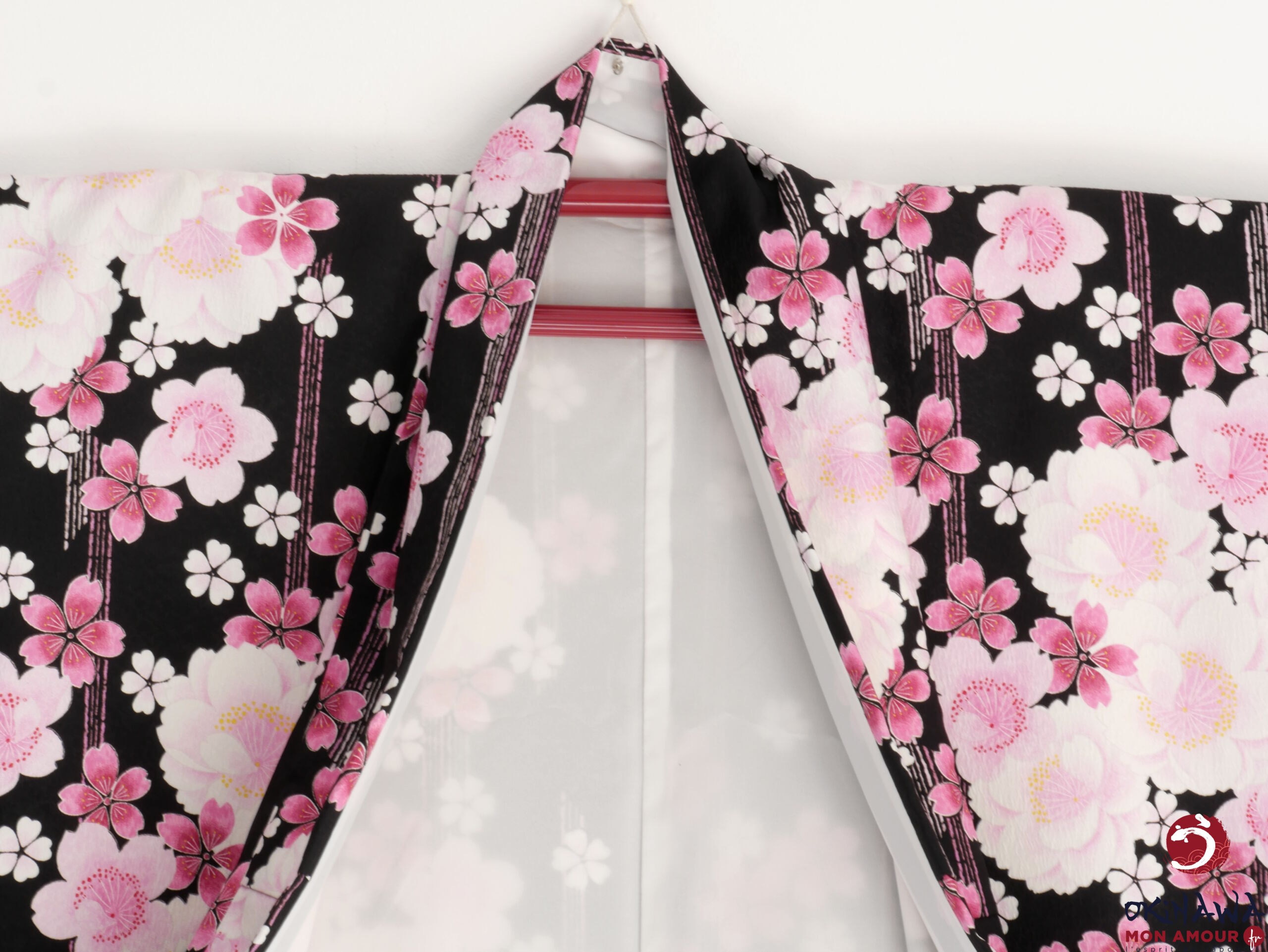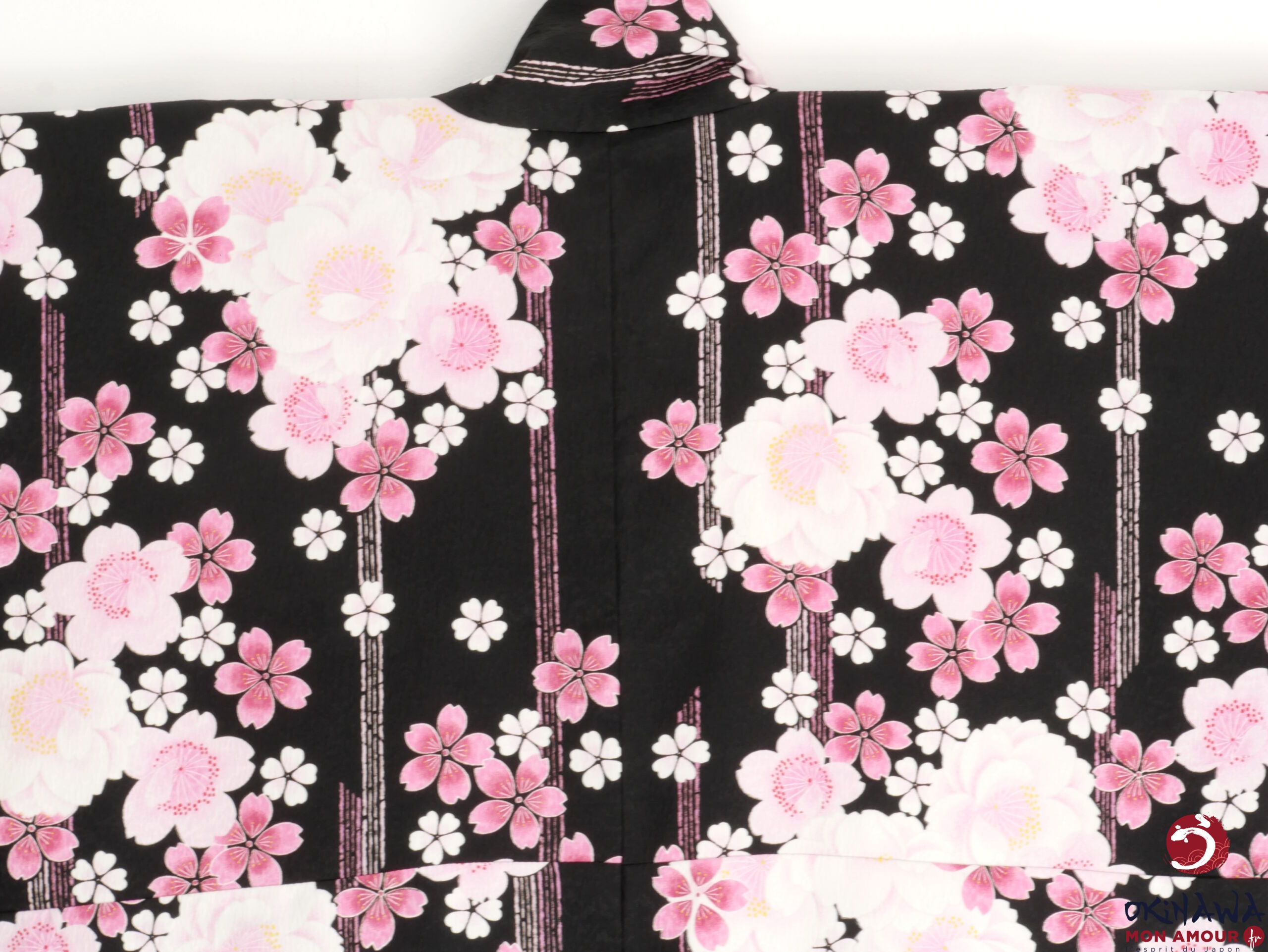 Kimono japonais court et large, moderne, noir orné d’une multitude de fleurs roses et blanches et de motifs verticaux rappelant le bambou.