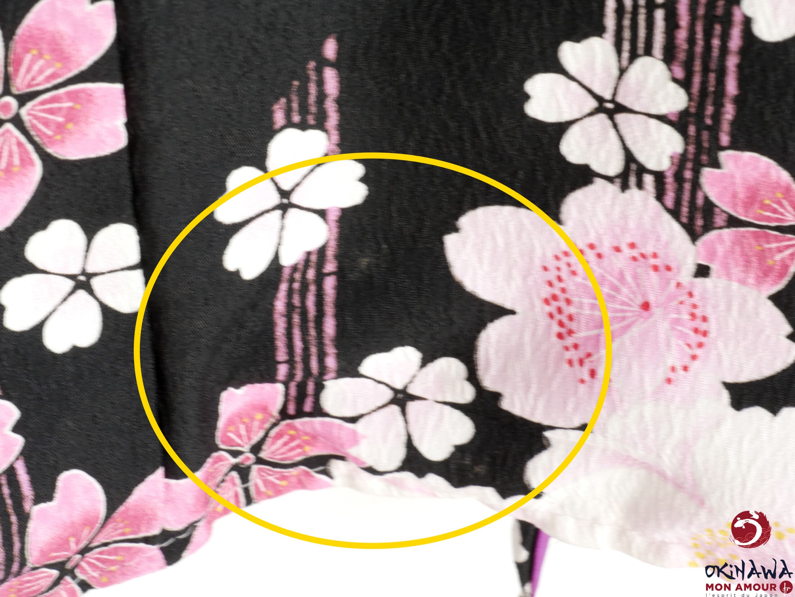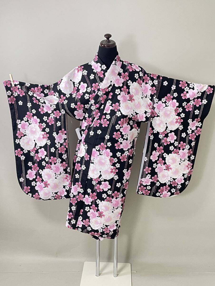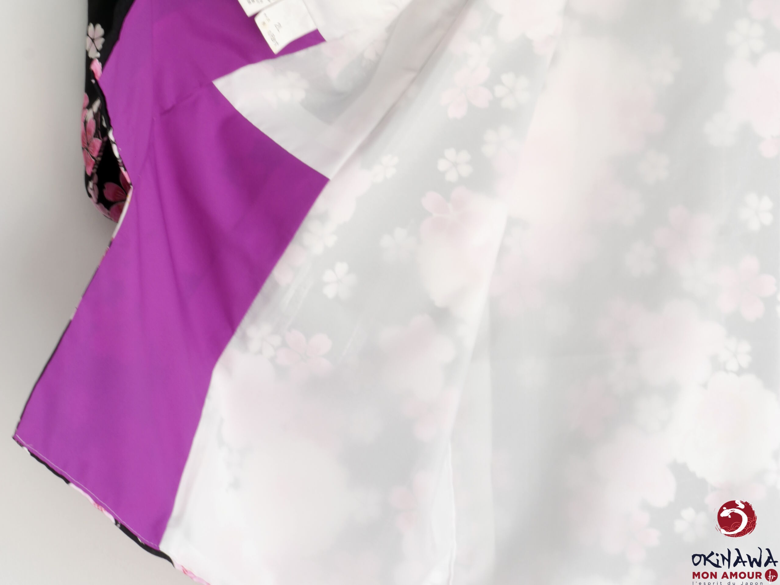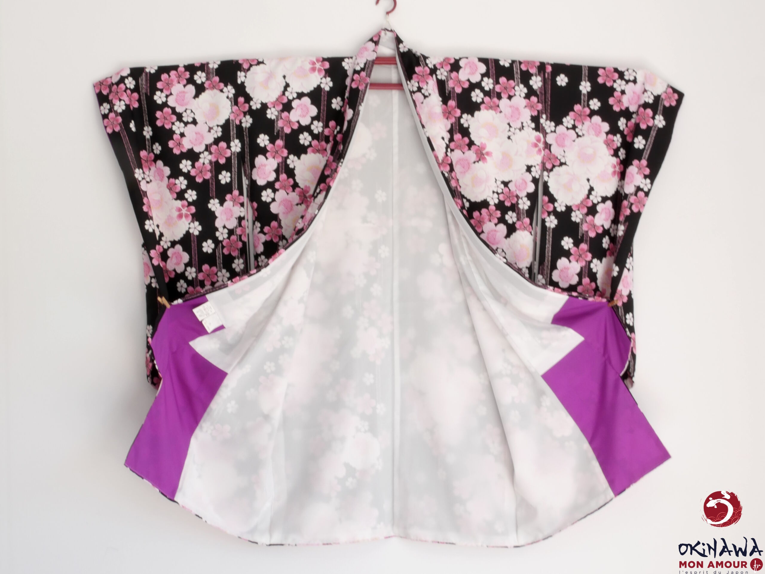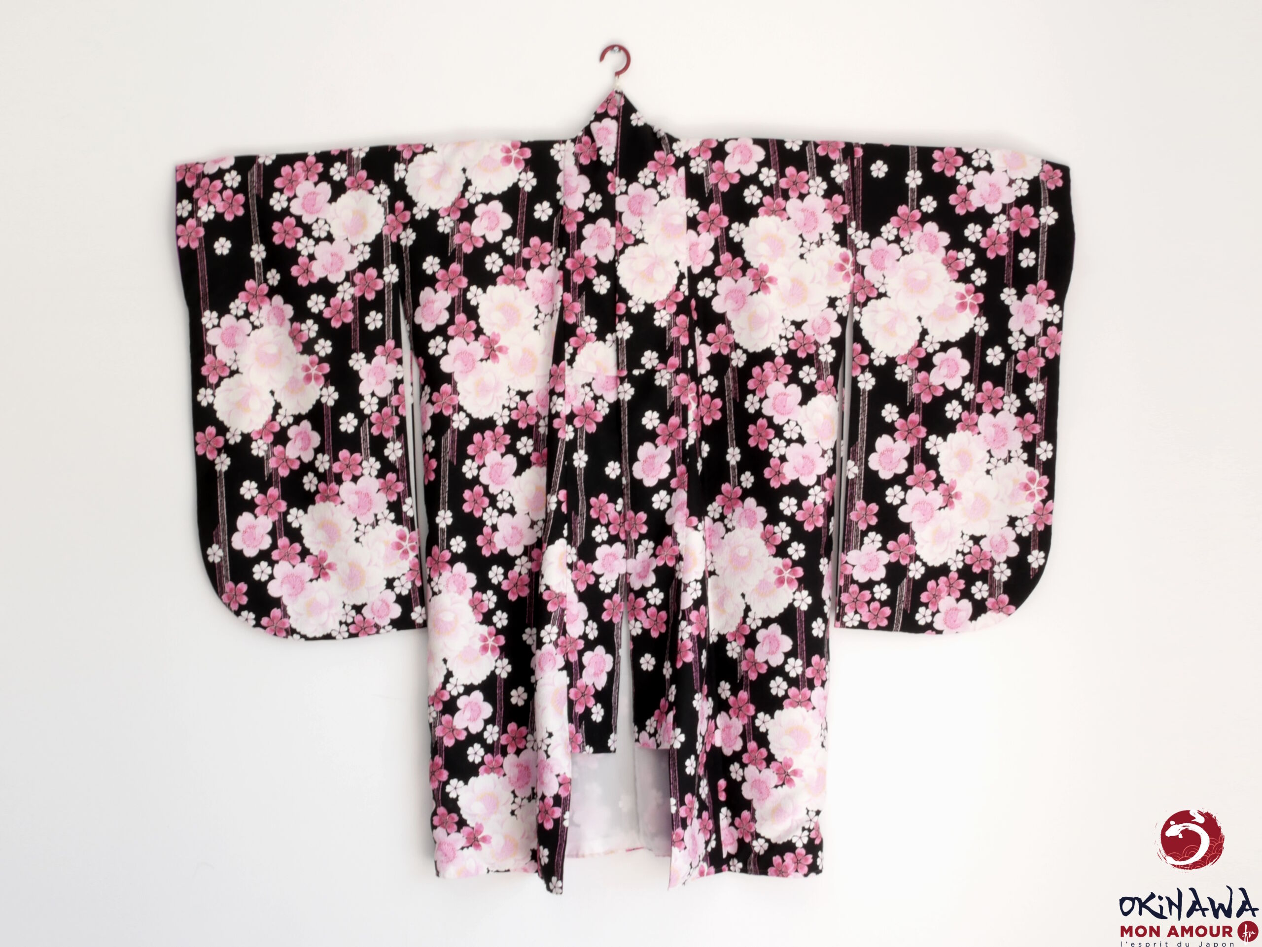 Kimono japonais court et large, moderne, noir orné d’une multitude de fleurs roses et blanches et de motifs verticaux rappelant le bambou.