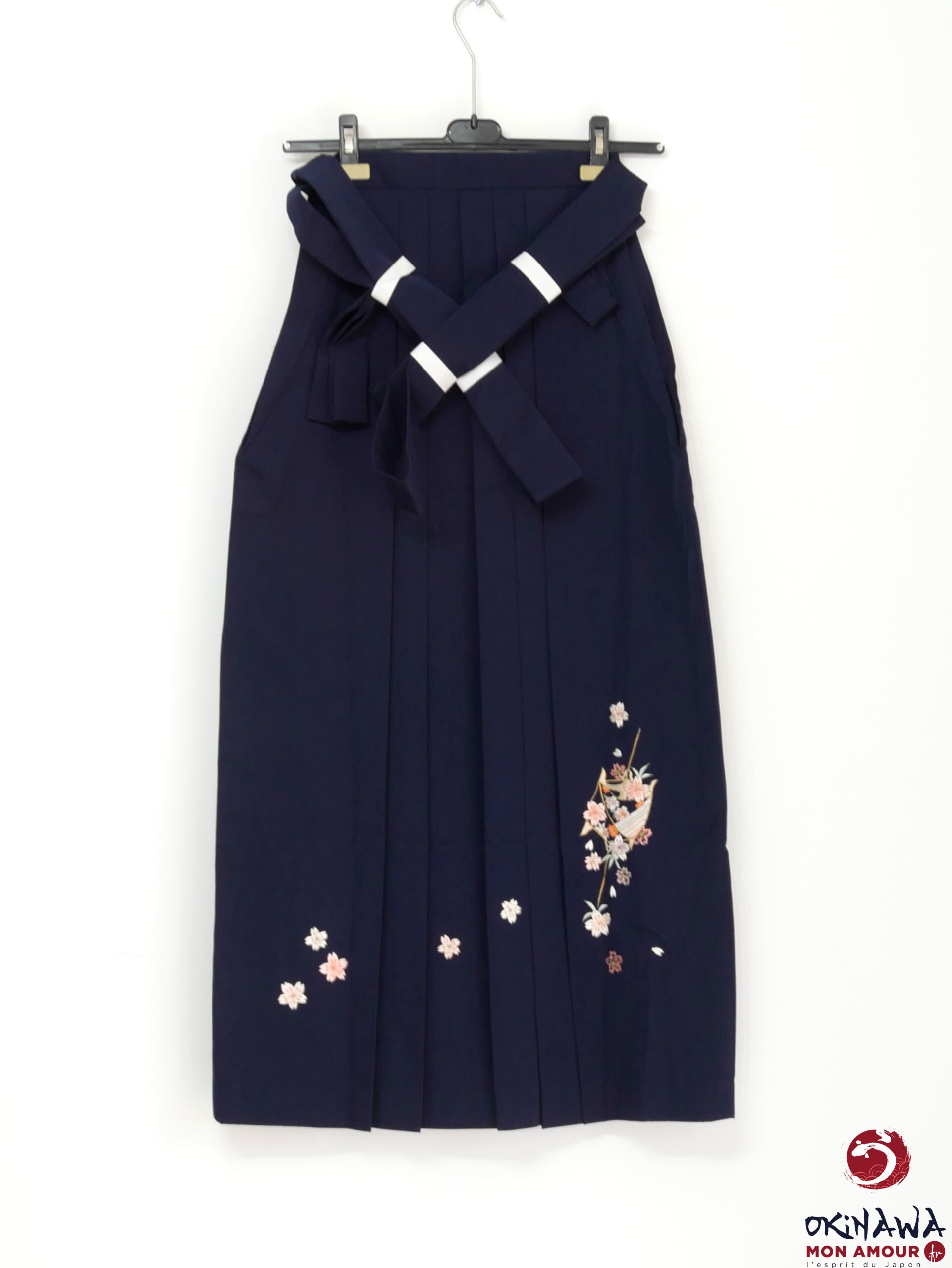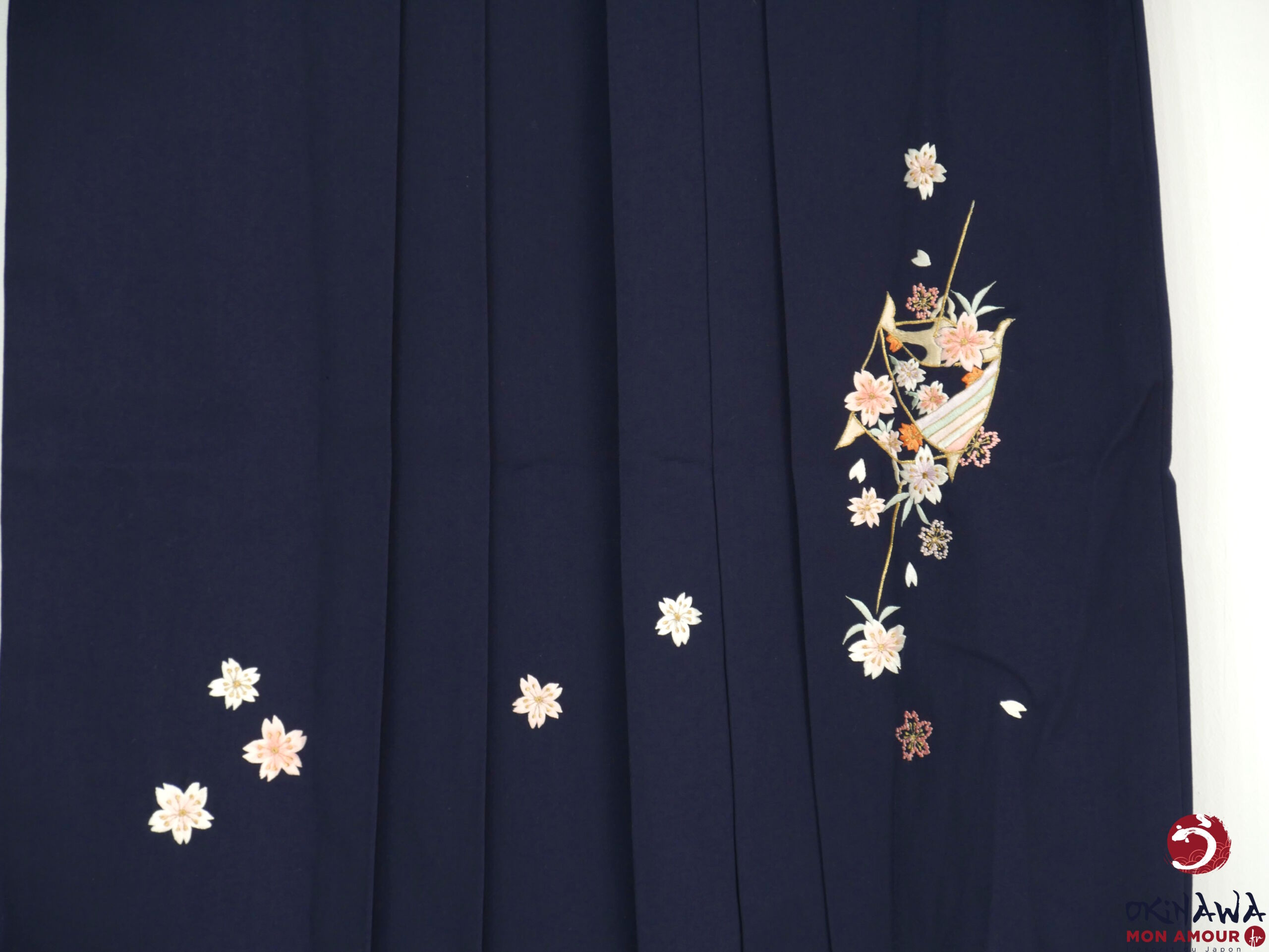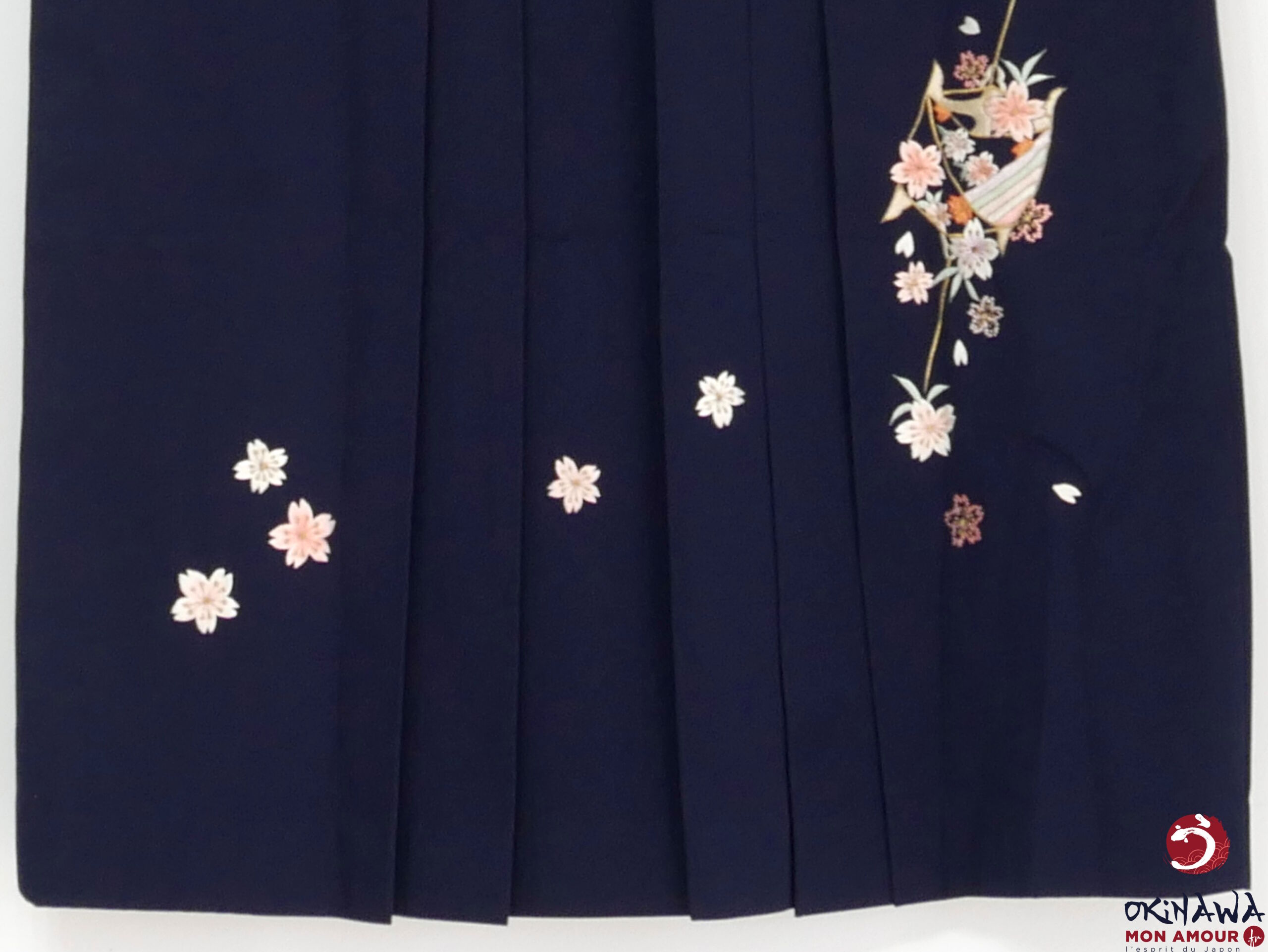 Hakama japonais femme traditionnel en coton et polyester, bleu nuit décoré de fleurs sakura brodées.