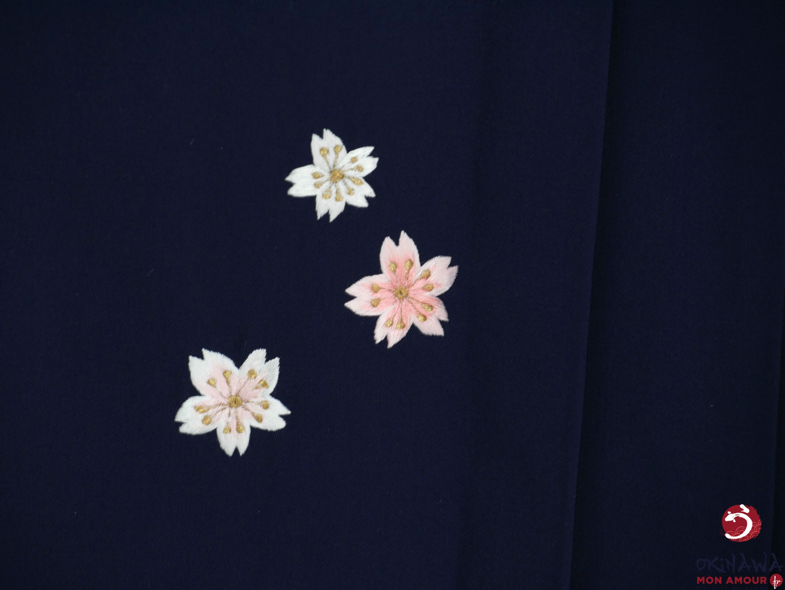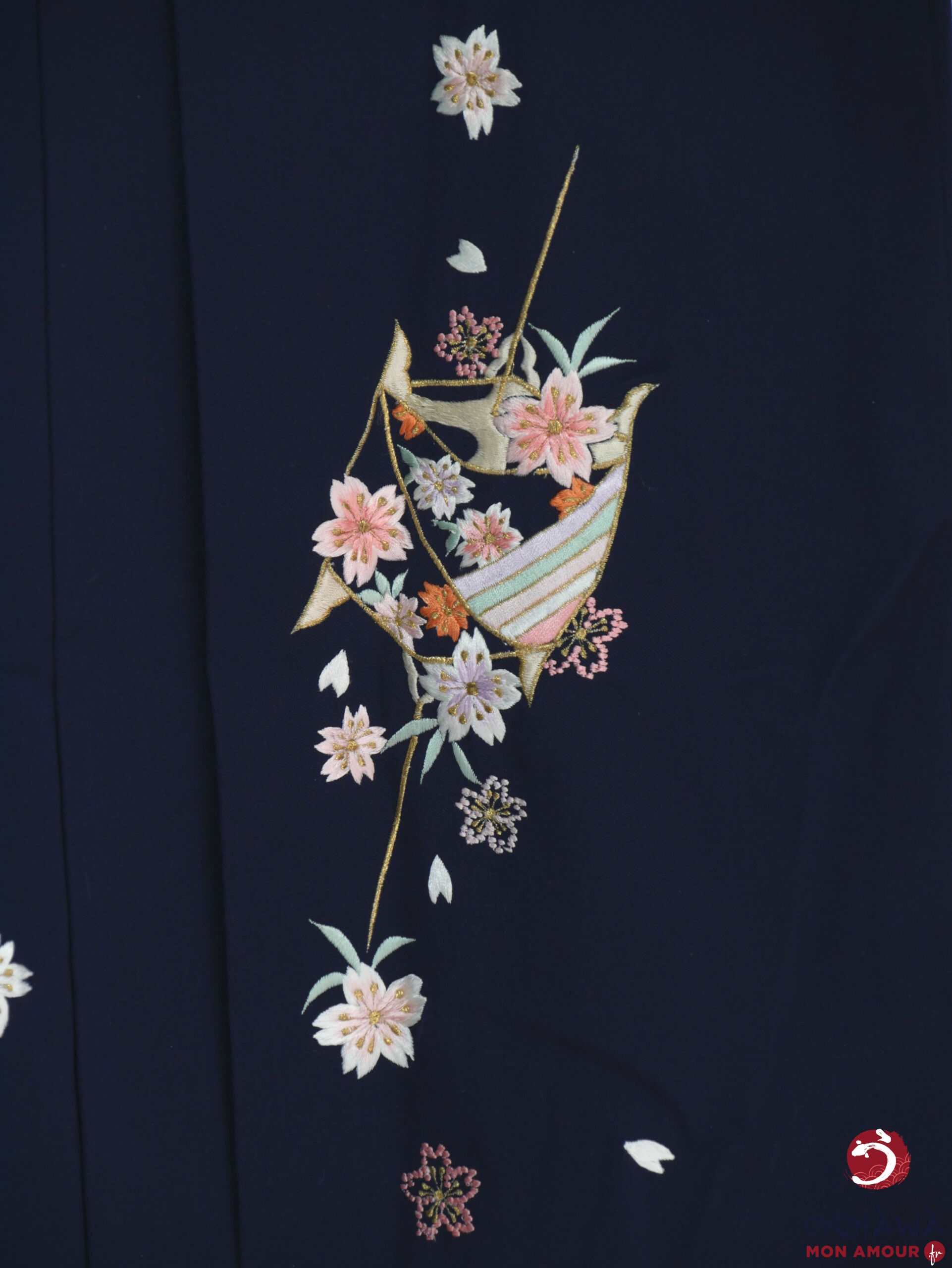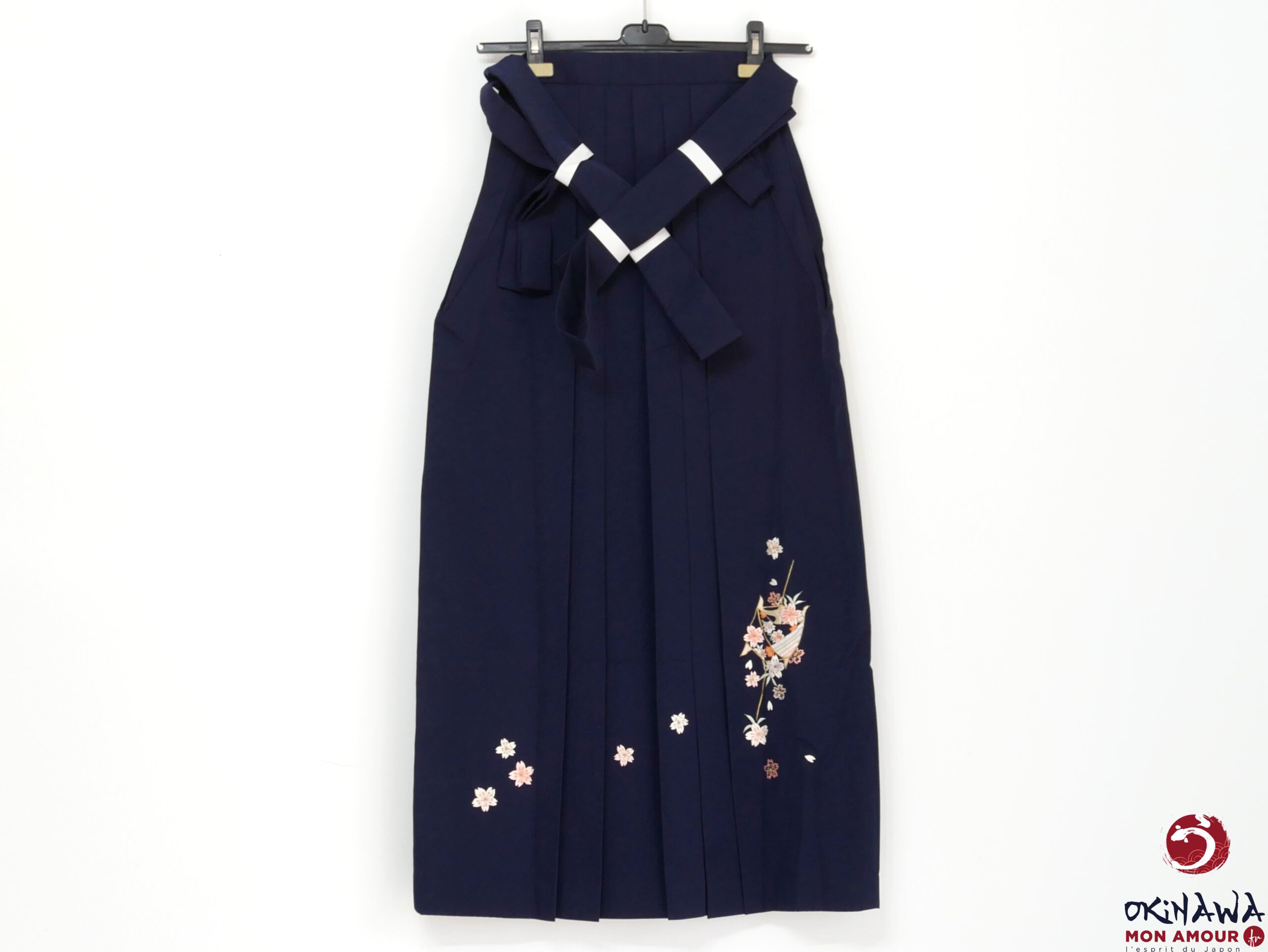 Hakama japonais femme traditionnel en coton et polyester, bleu nuit décoré de fleurs sakura brodées.