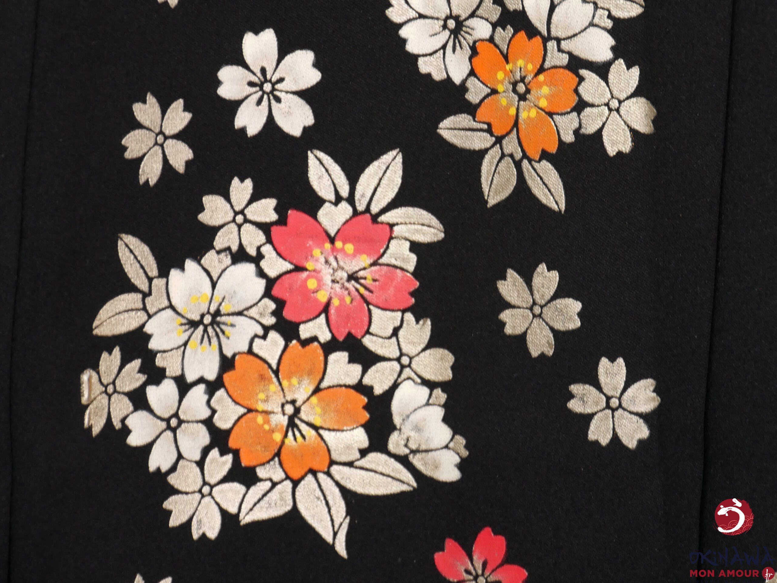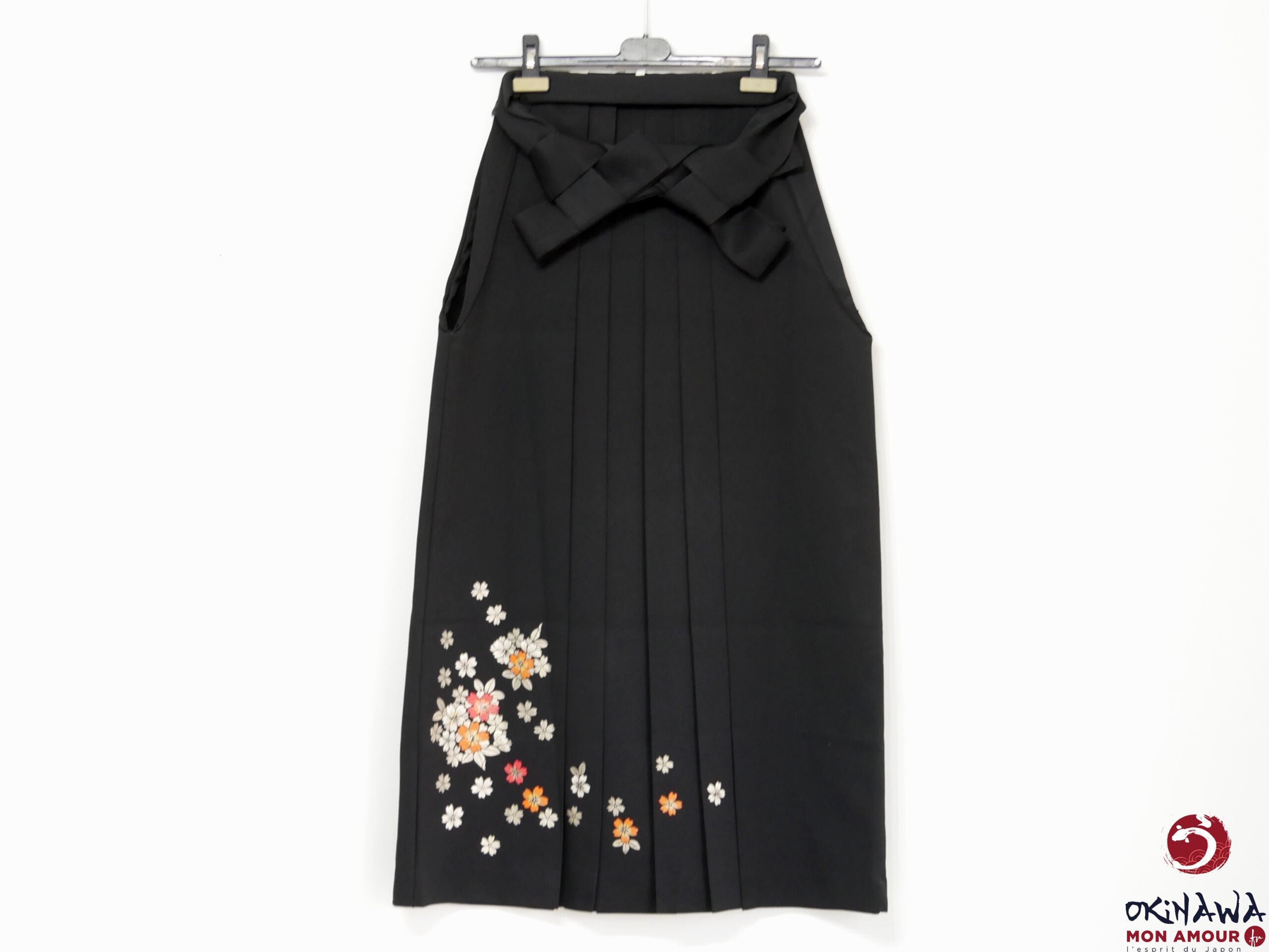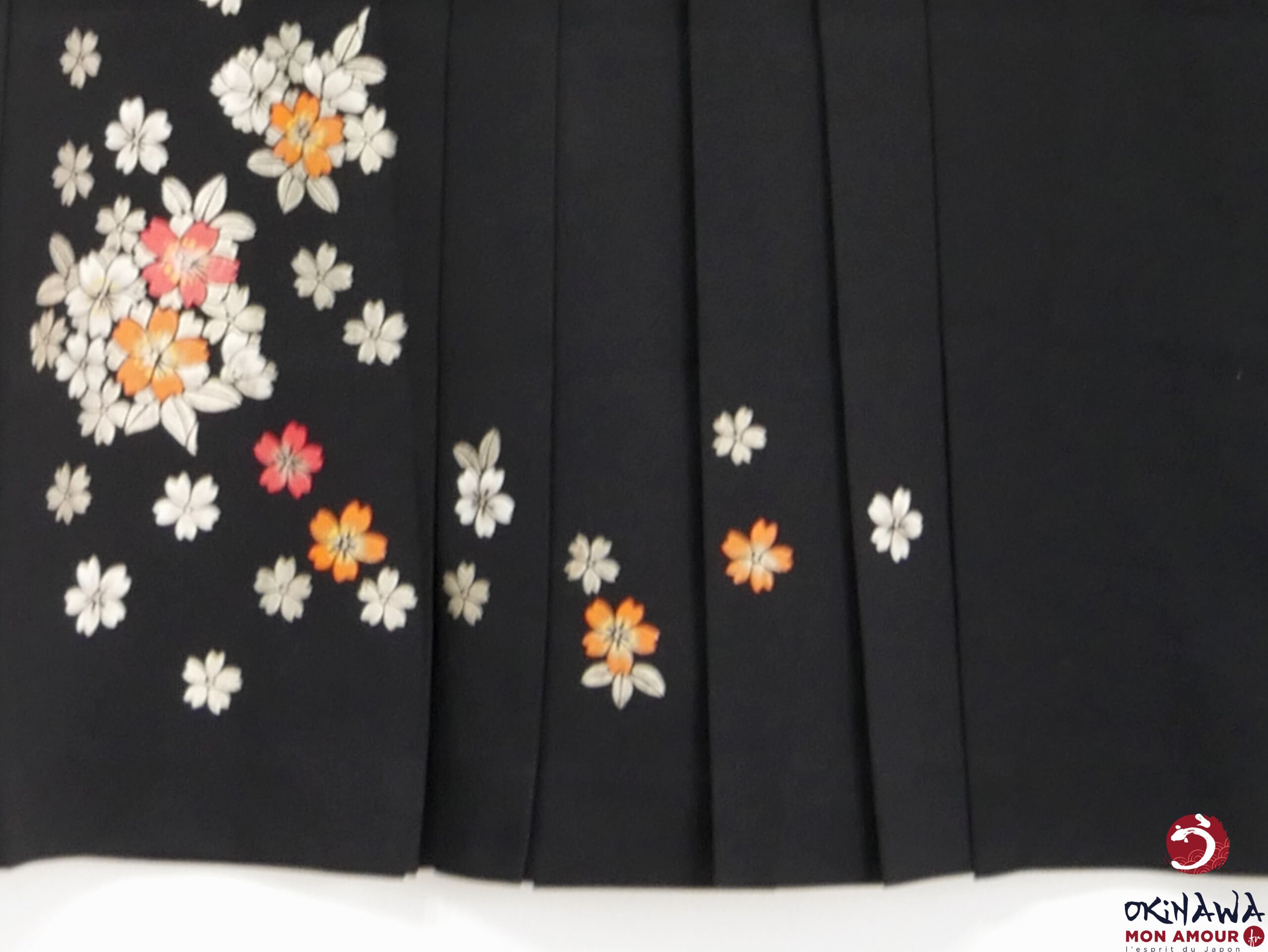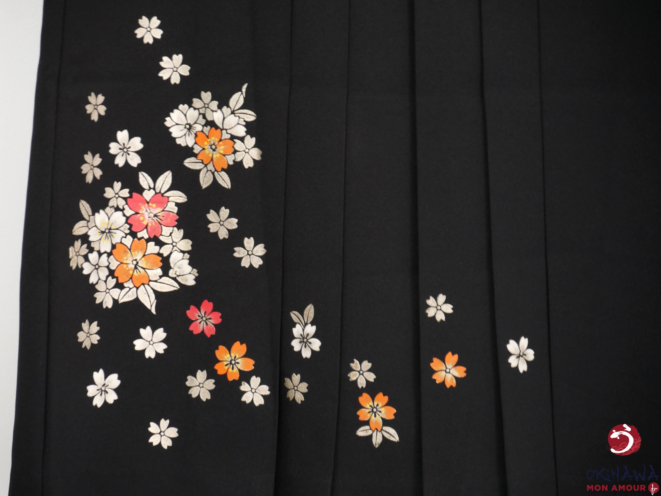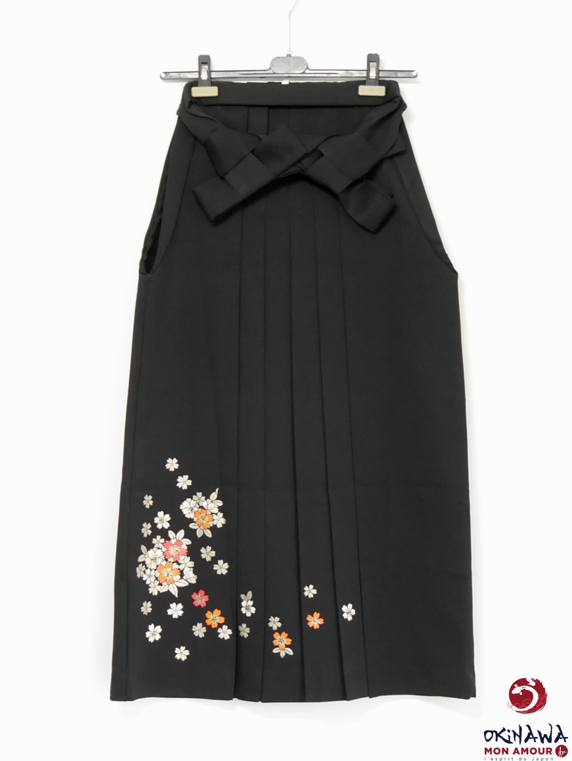 Hakama japonais femme traditionnel en polyester, noir avec des fleurs sakura peintes sur le tissu.