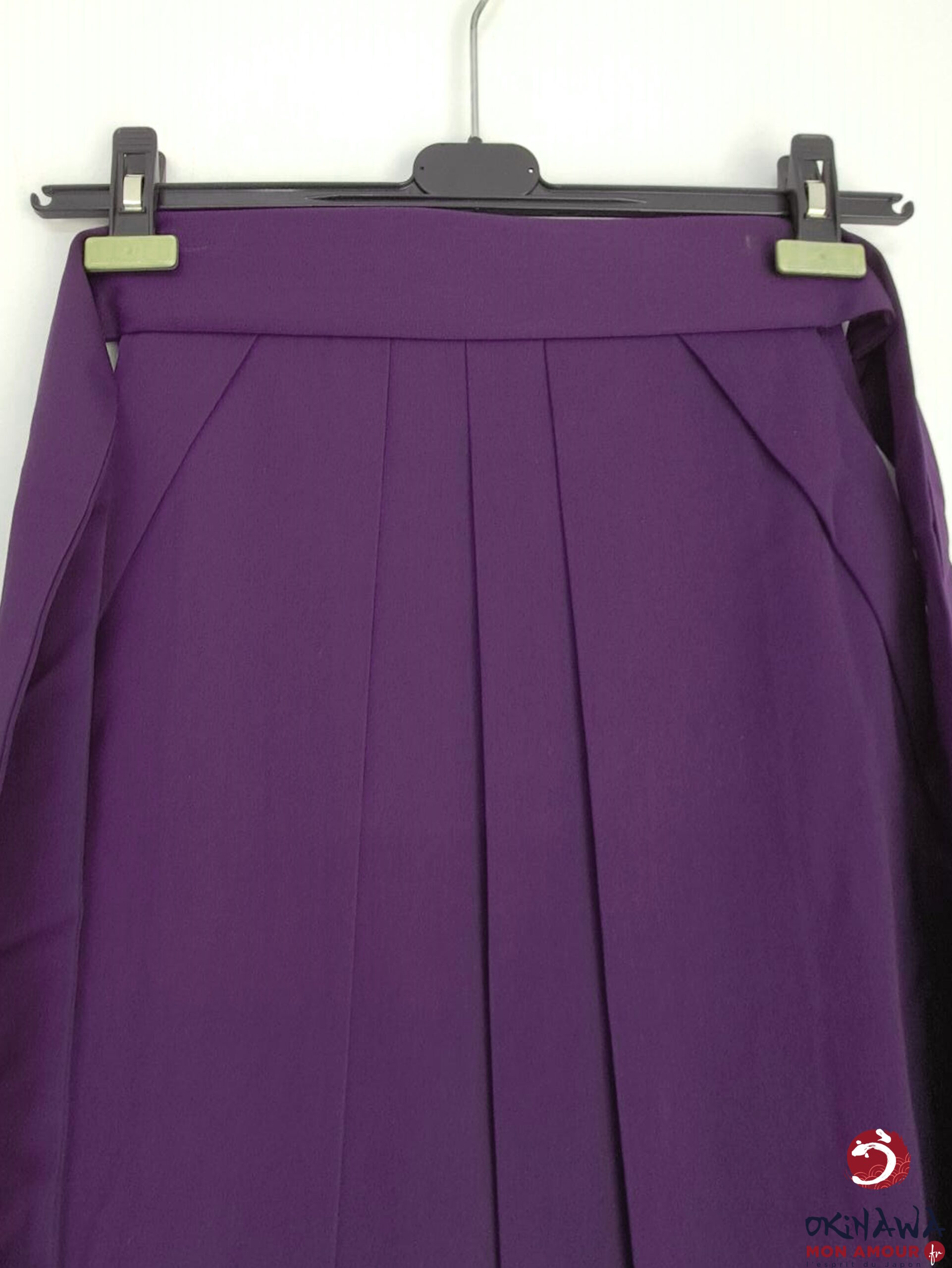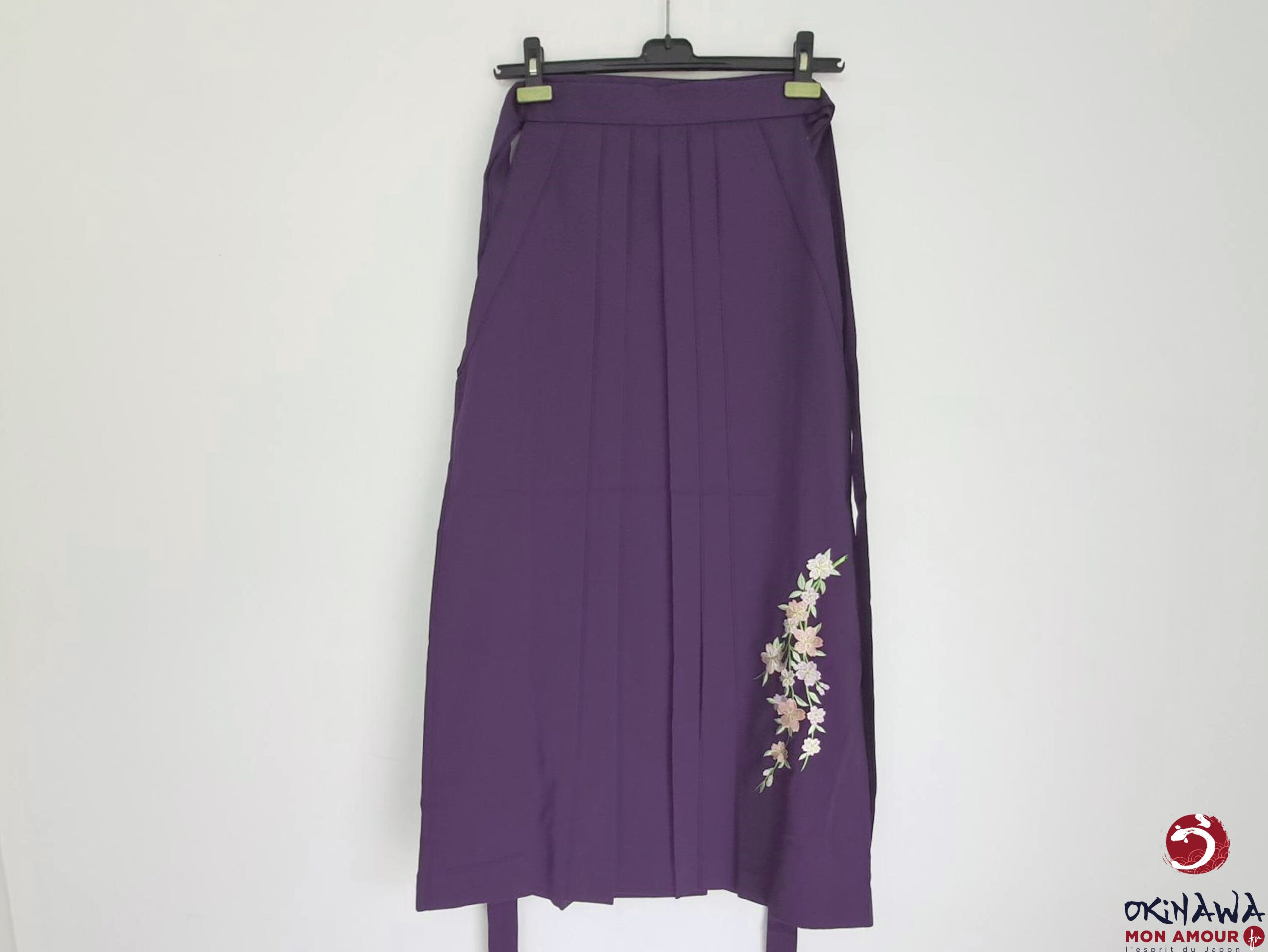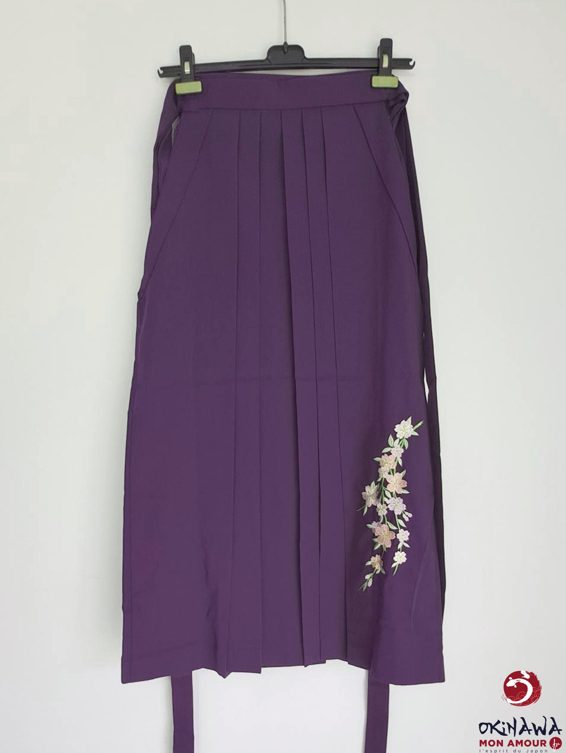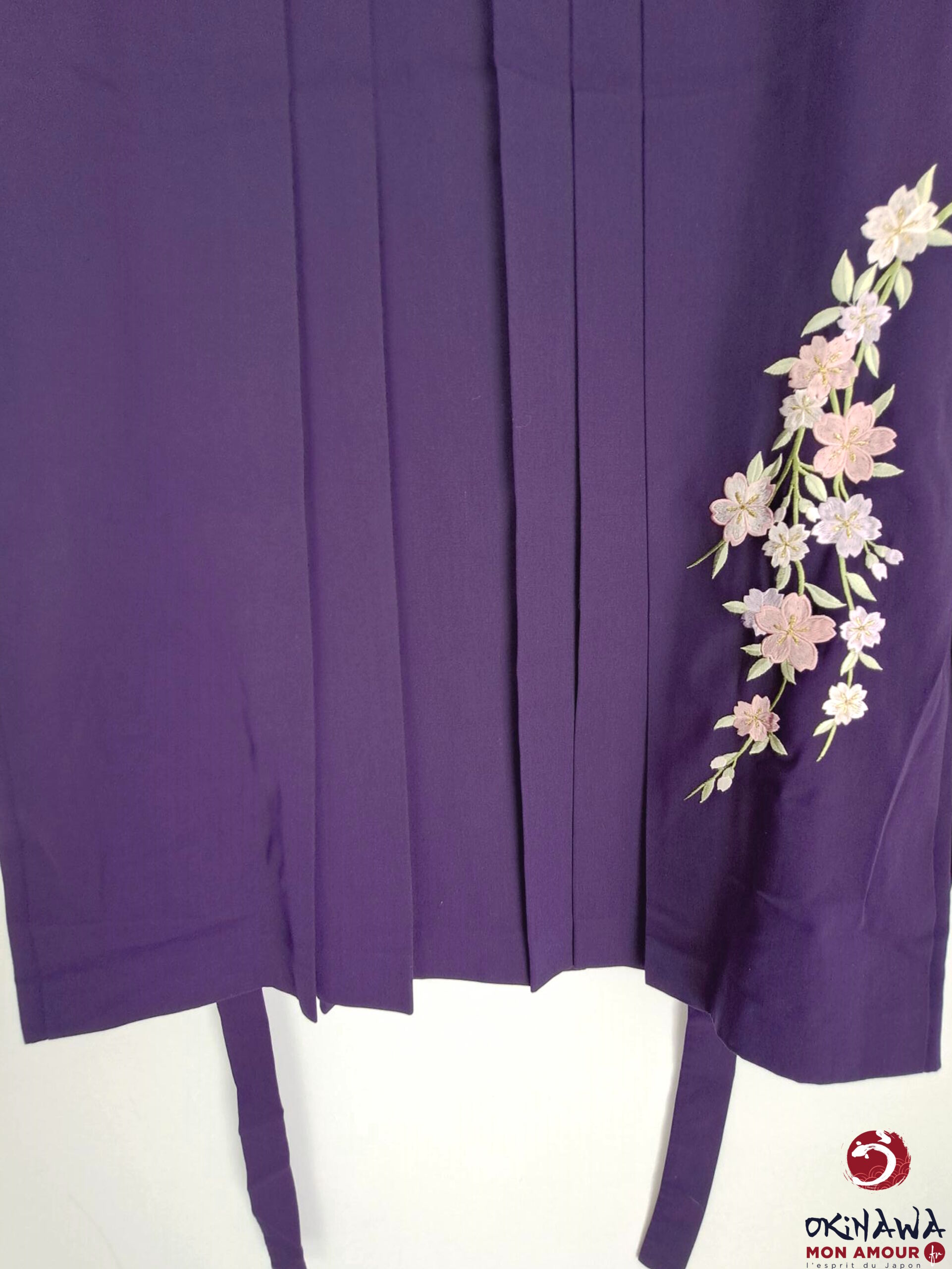 Hakama japonais femme traditionnel en coton et polyester, violet avec des fleurs sakura brodées.