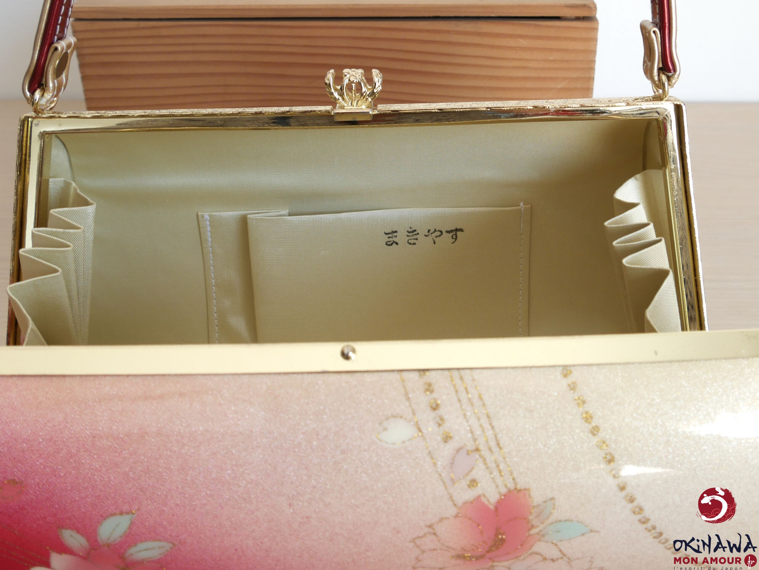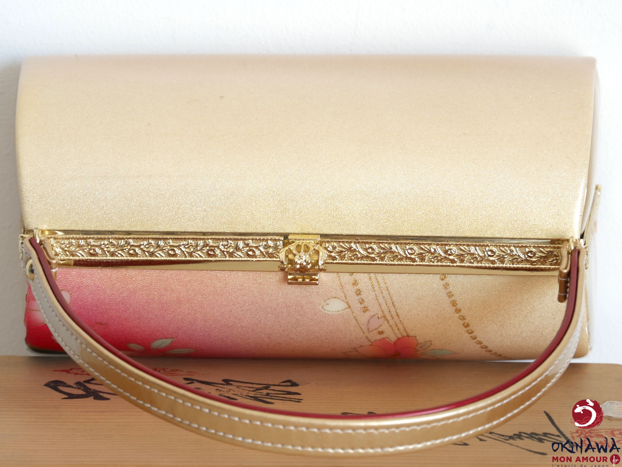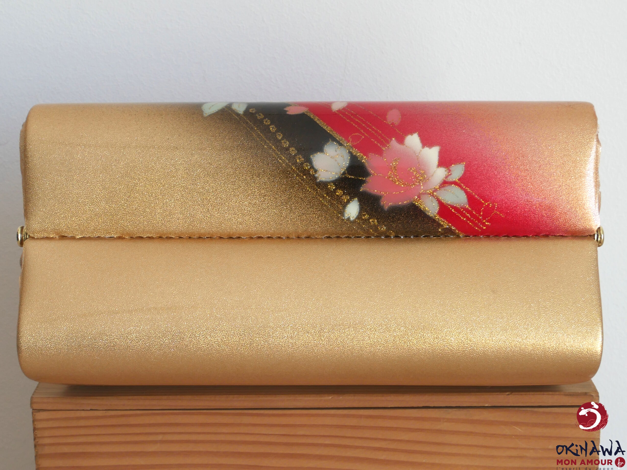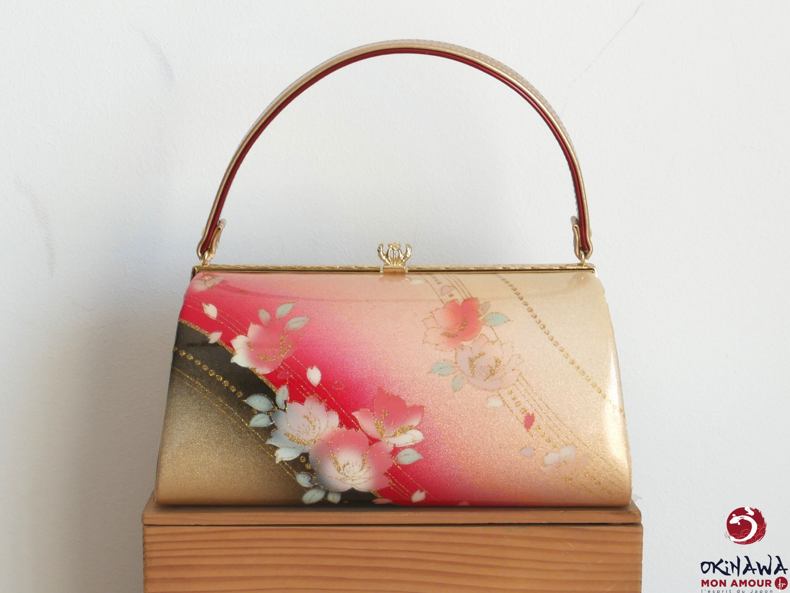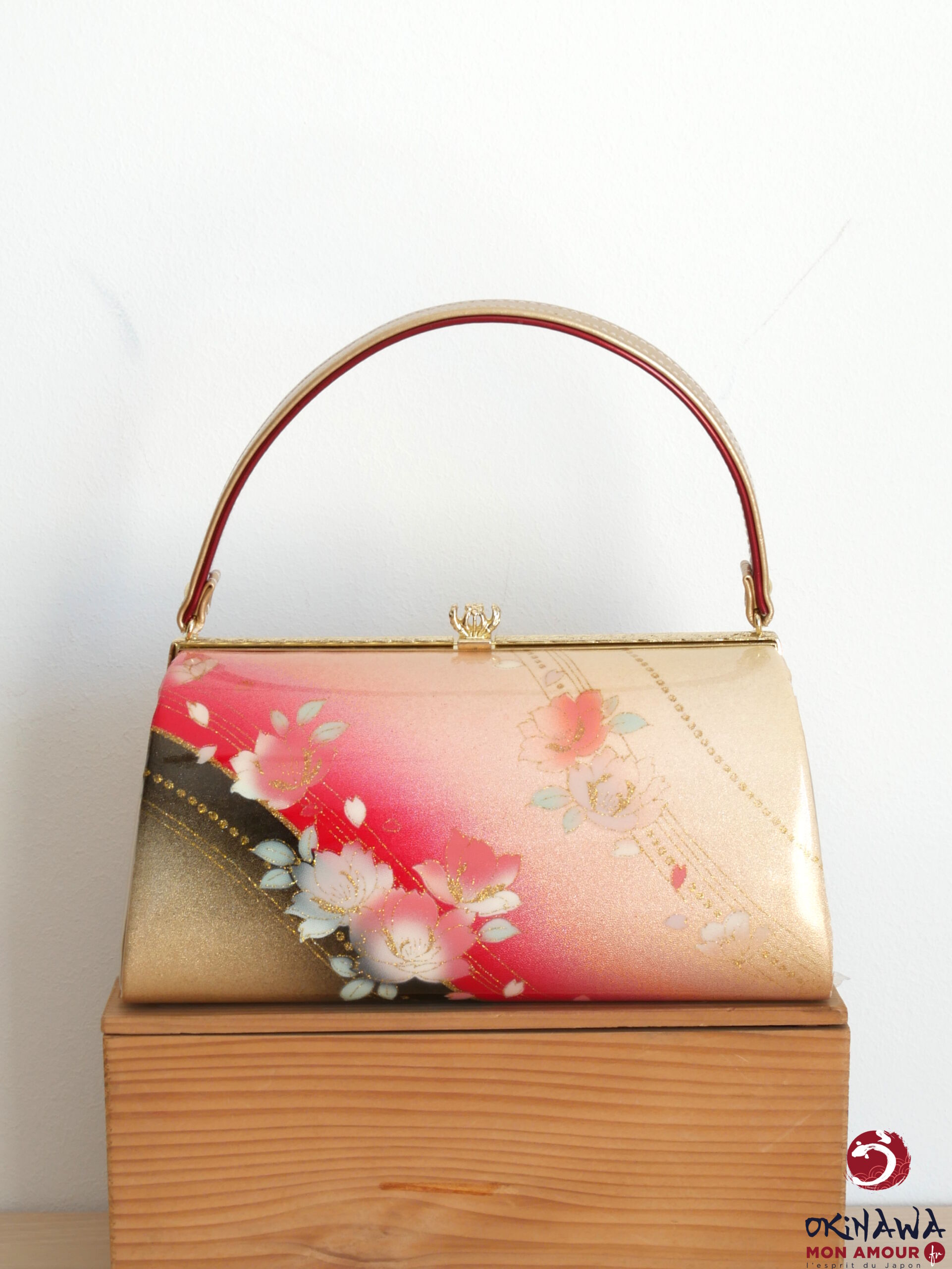 Sac à main japonais rouge, noir et doré, orné de fleurs roses et blanches.
