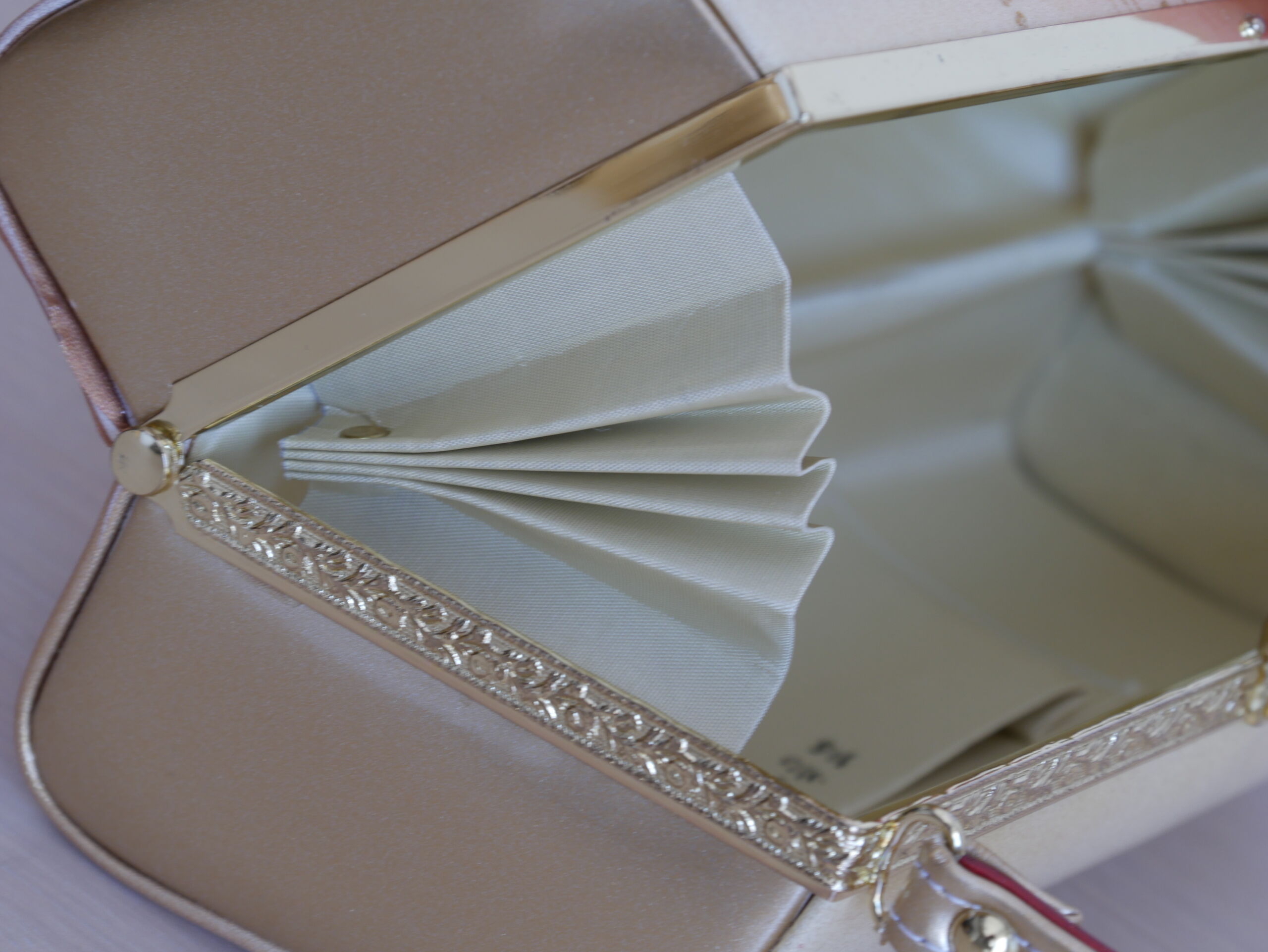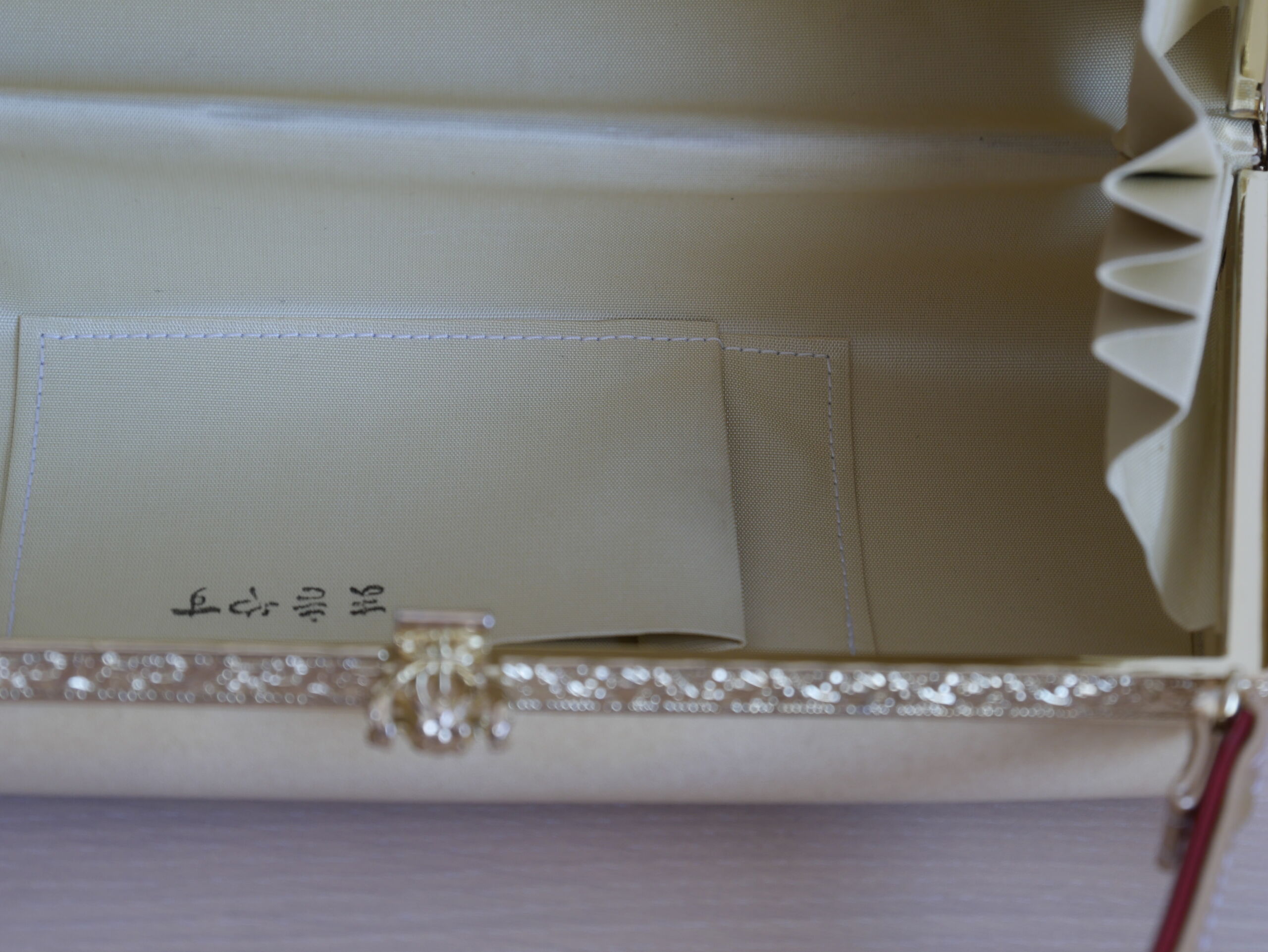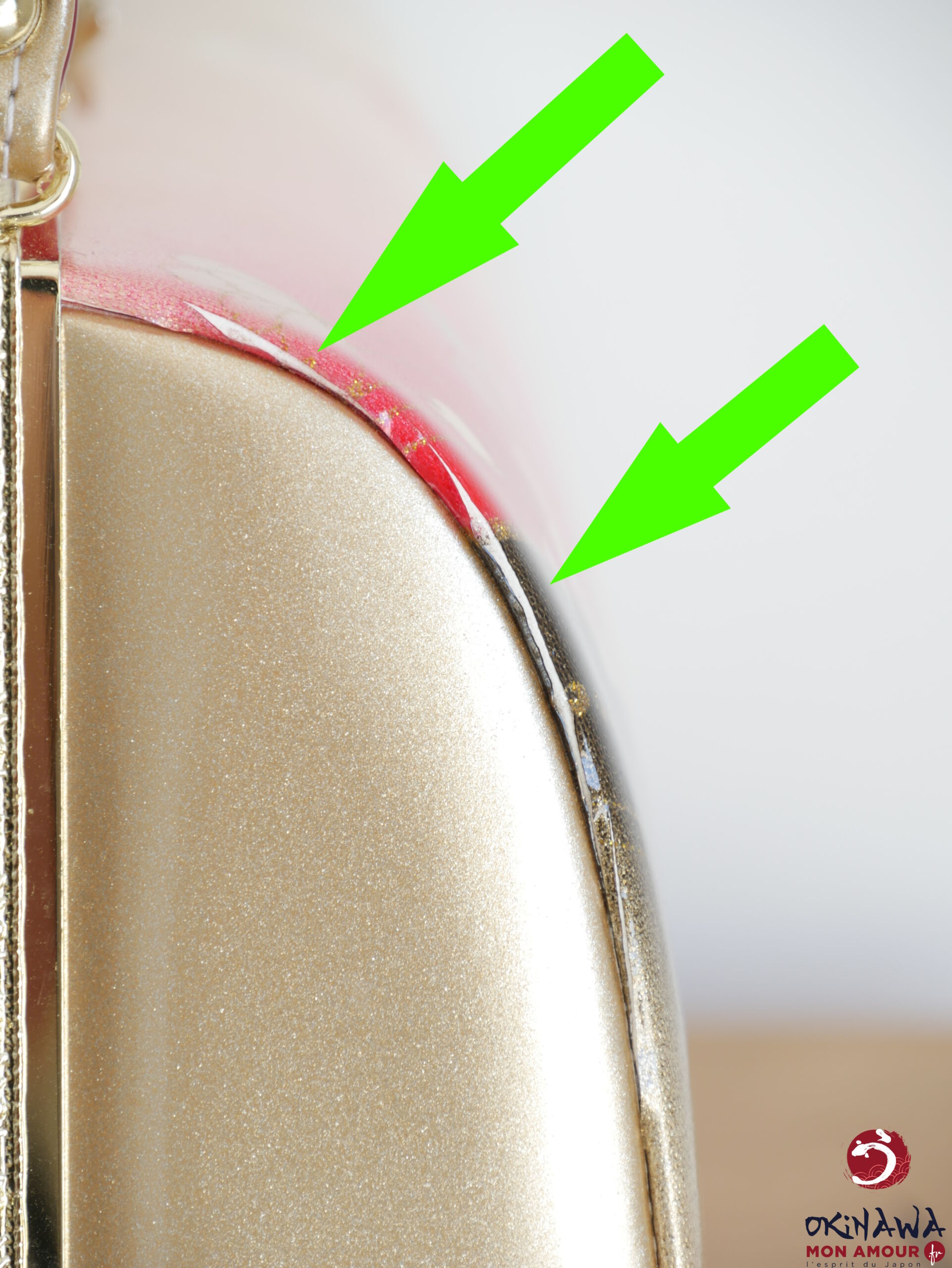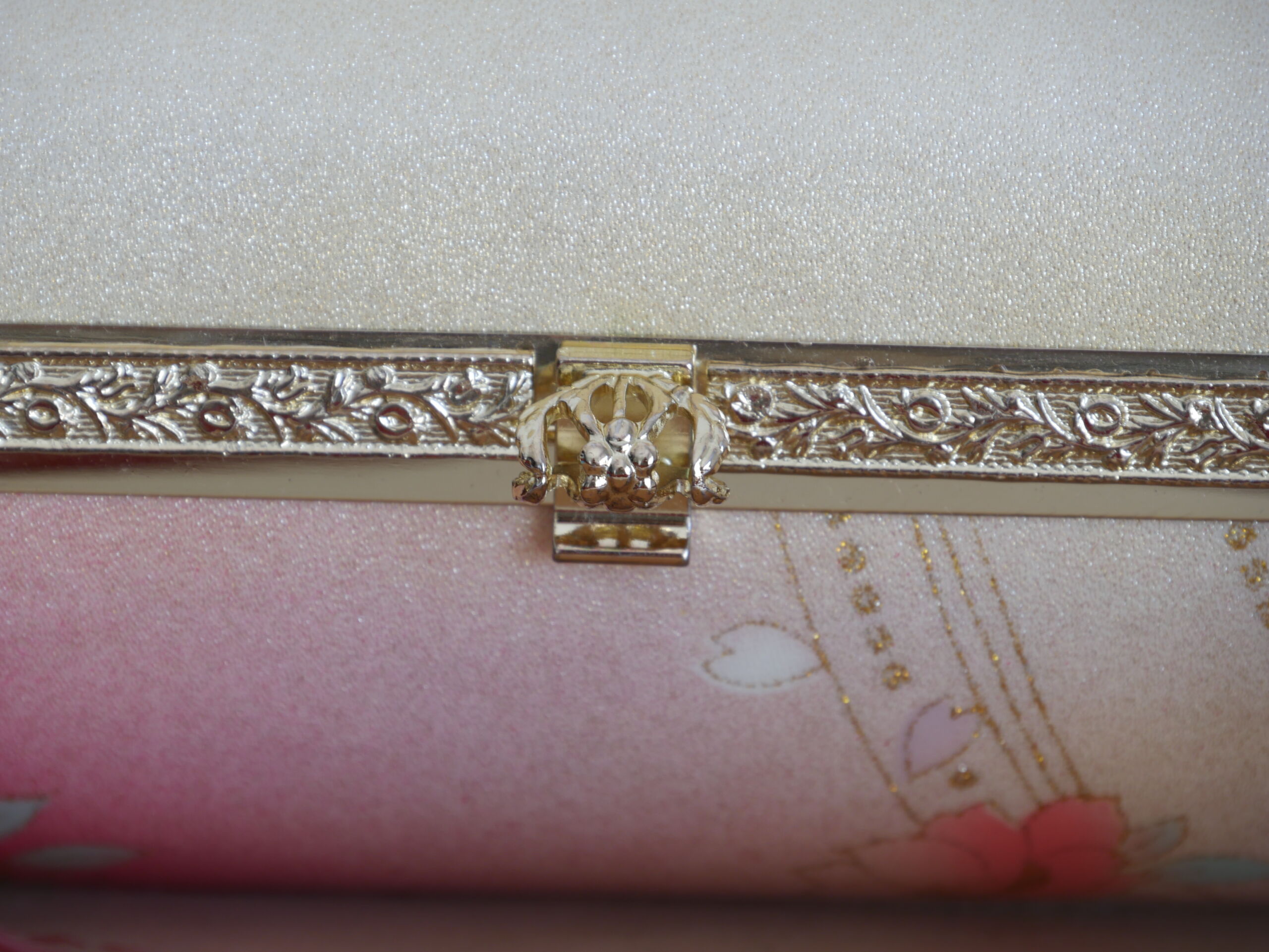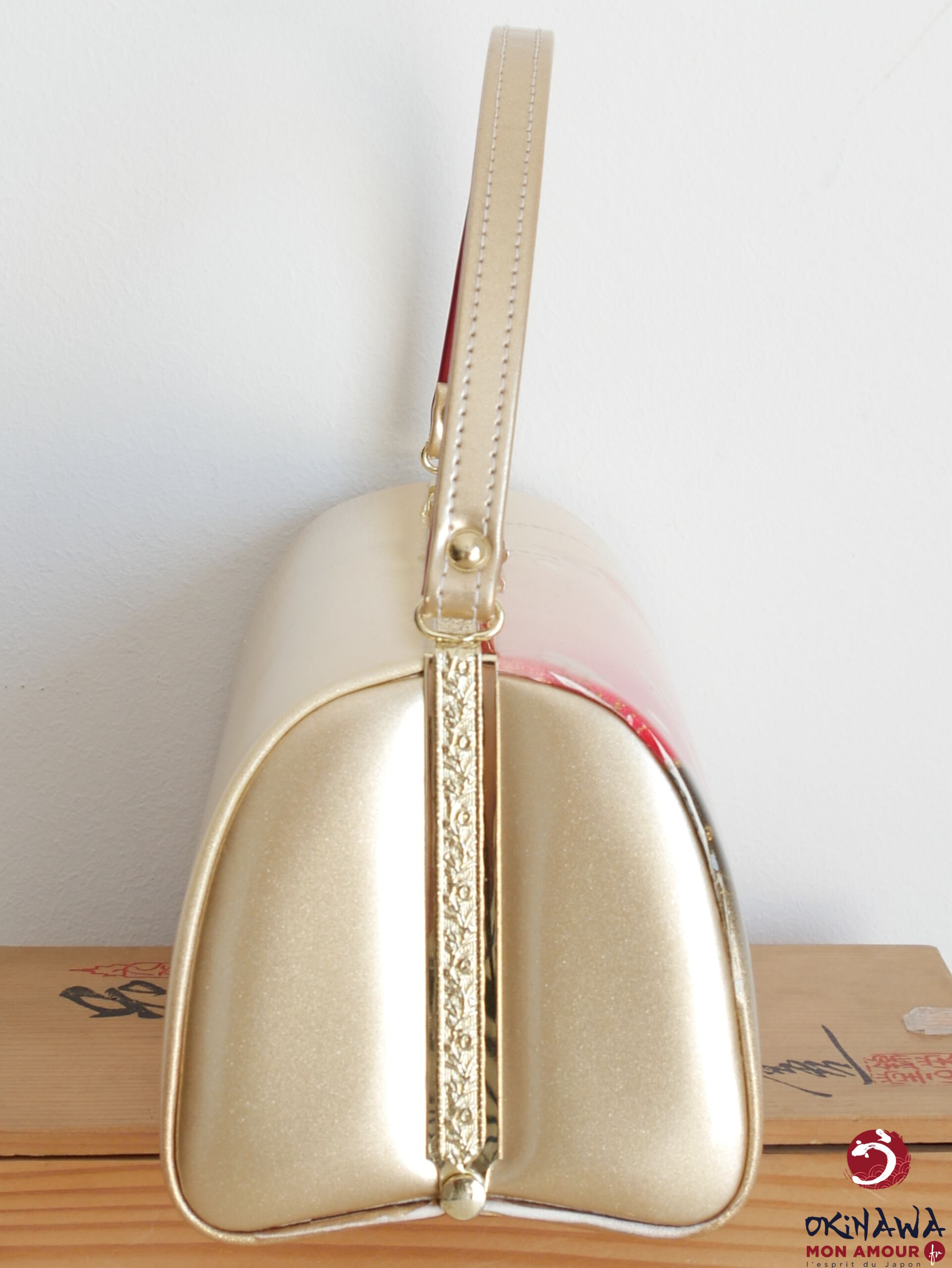 Sac à main japonais rouge, noir et doré, orné de fleurs roses et blanches.